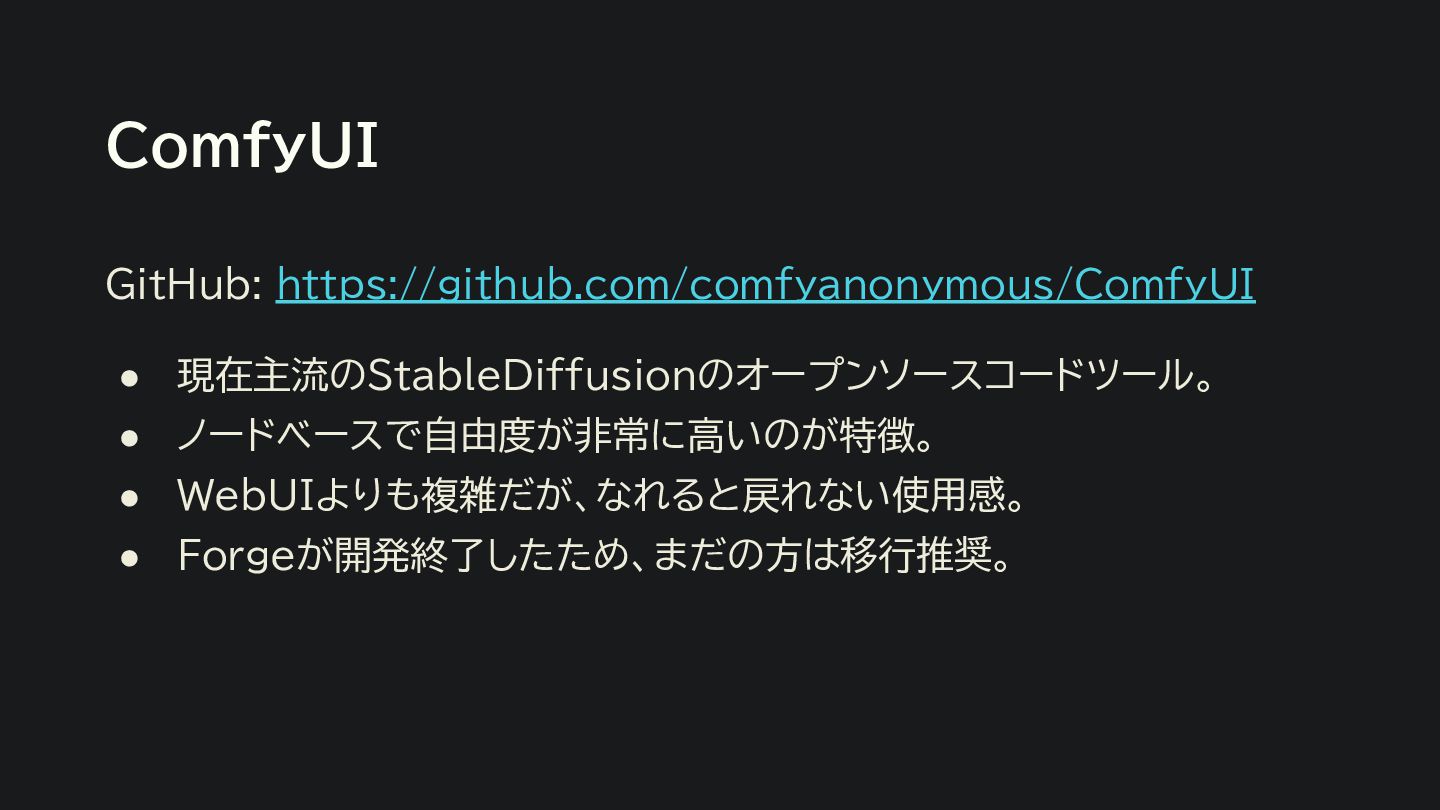 ComfyUI GitHub: https://github.com/comfyanonymous/ComfyUI • 現在主流のStableDiffusionのオープンソースコードツール。 • ノードベースで自由度が非常に高いのが特徴。 • WebUIよりも複雑だが、なれると戻れない使用感。 •