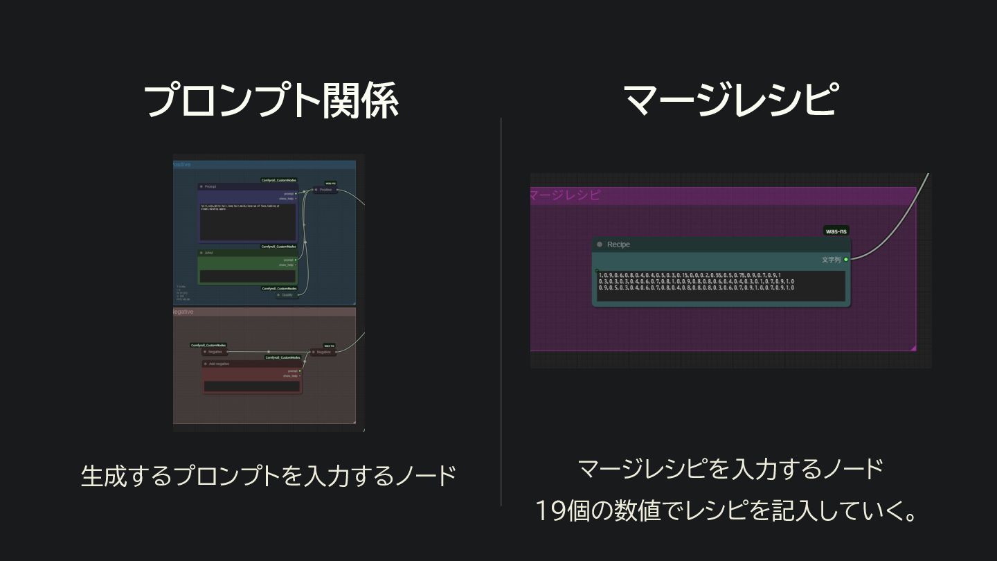 プロンプト関係 生成するプロンプトを入力するノード マージレシピを入力するノード 19個の数値でレシピを記入していく。 マージレシピ