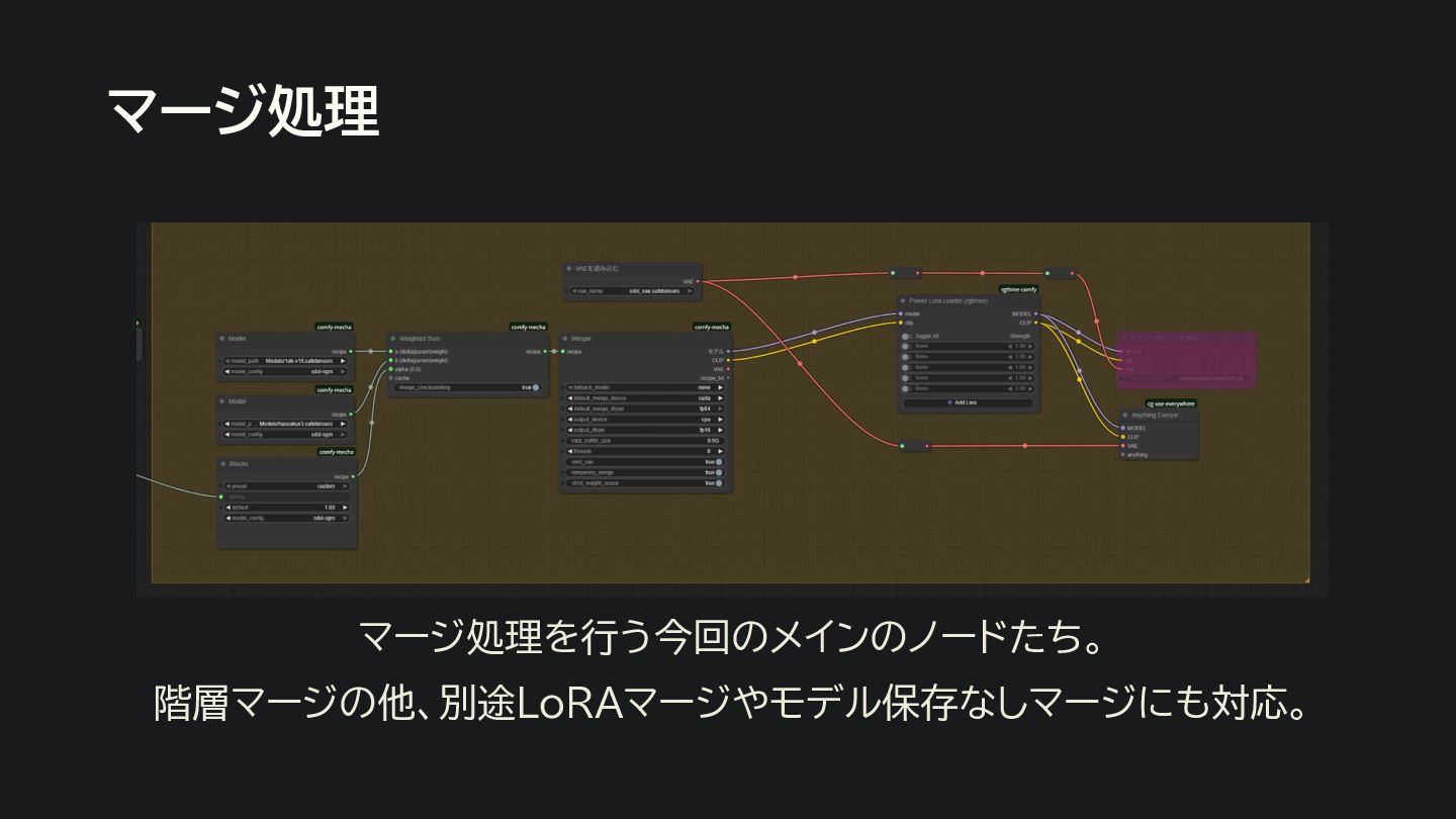 マージ処理 マージ処理を行う今回のメインのノードたち。 階層マージの他、別途LoRAマージやモデル保存なしマージにも対応。
