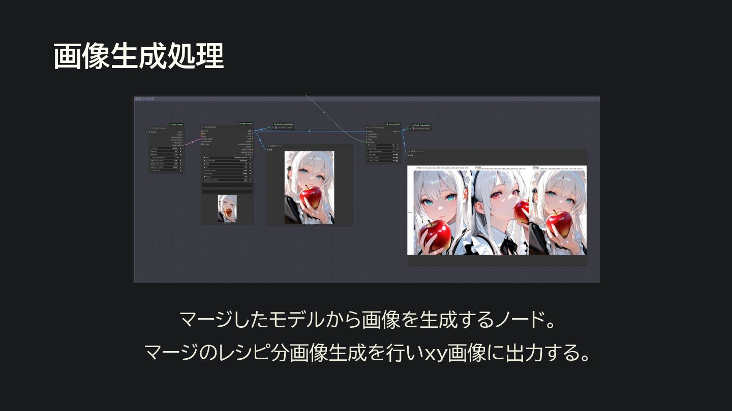 画像生成処理 マージしたモデルから画像を生成するノード。 マージのレシピ分画像生成を行いxy画像に出力する。