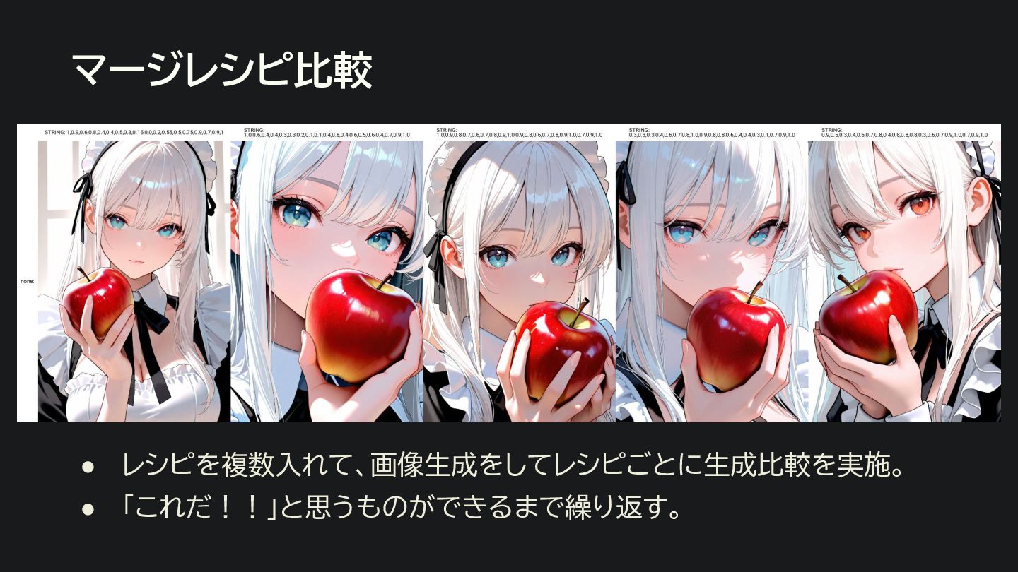 マージレシピ比較 • レシピを複数入れて、画像生成をしてレシピごとに生成比較を実施。 • 「これだ!!」と思うものができるまで繰り返す。