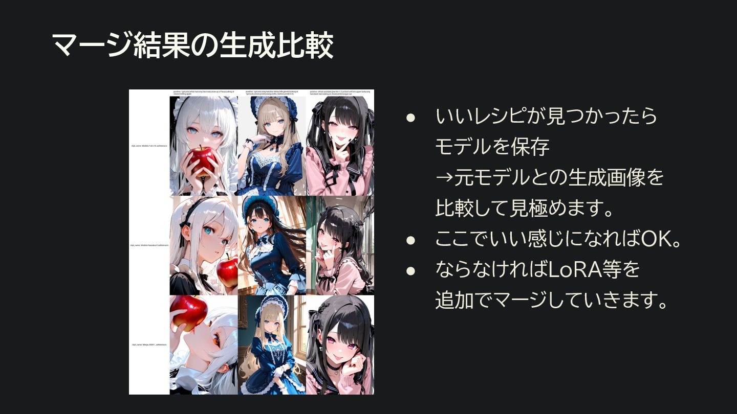 マージ結果の生成比較 • いいレシピが見つかったら モデルを保存 →元モデルとの生成画像を 比較して見極めます。 • ここでいい感じになればOK。 • ならなければLoRA等を
