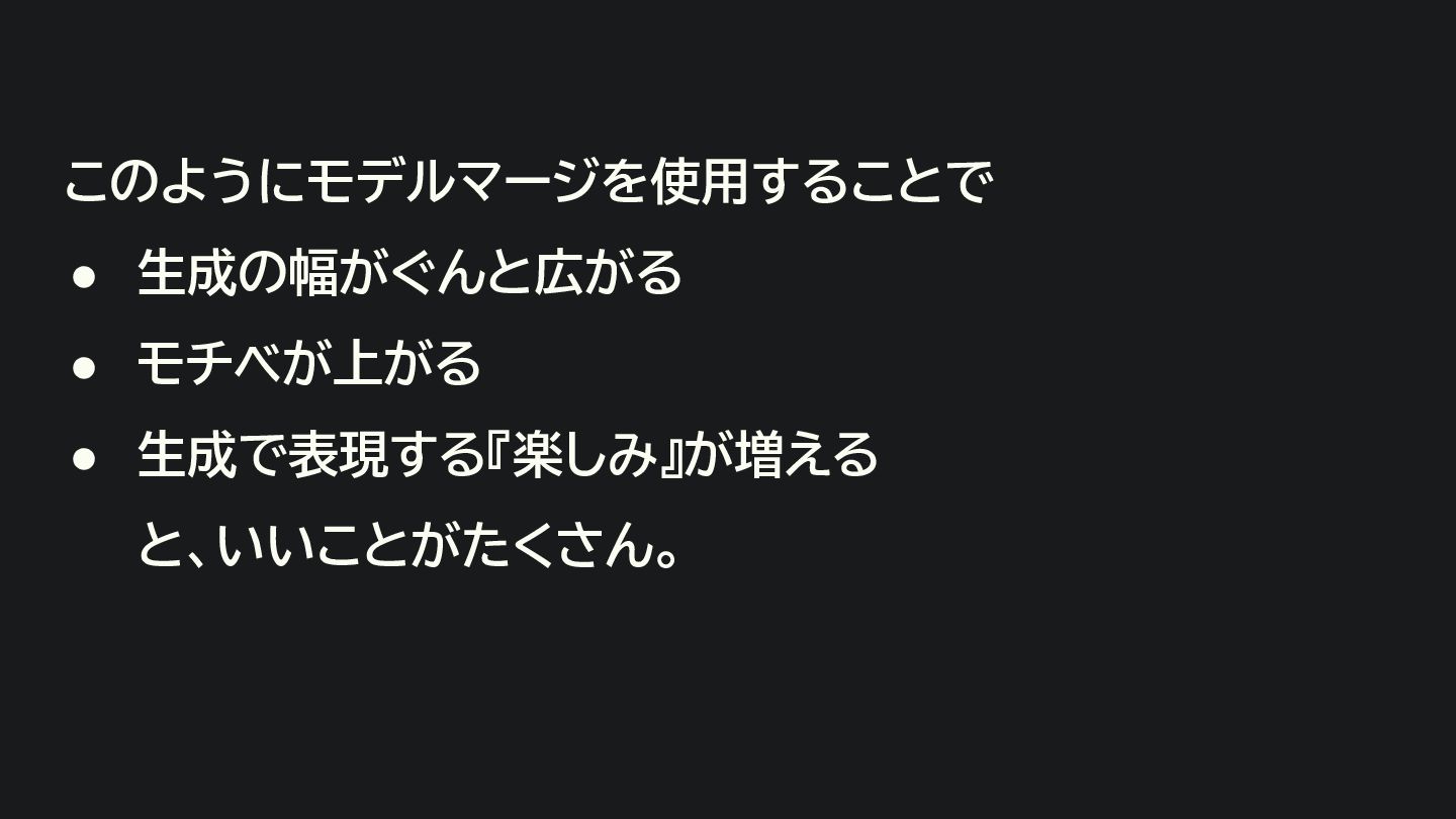 このようにモデルマージを使用することで • 生成の幅がぐんと広がる • モチベが上がる • 生成で表現する『楽しみ』が増える と、いいことがたくさん。