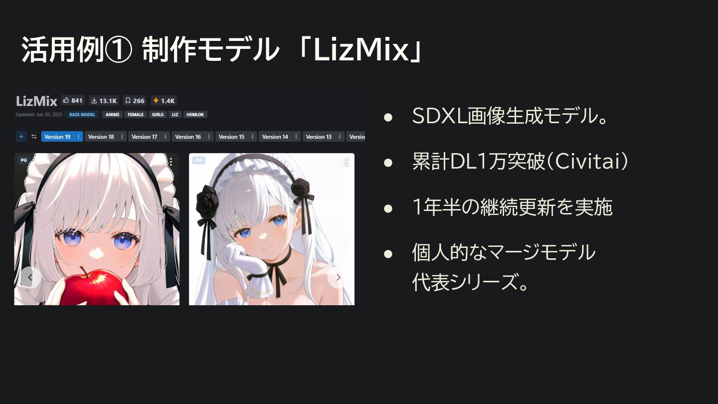 活用例① 制作モデル 「LizMix」 • SDXL画像生成モデル。 • 累計DL1万突破(Civitai) • 1年半の継続更新を実施 • 個人的なマージモデル
