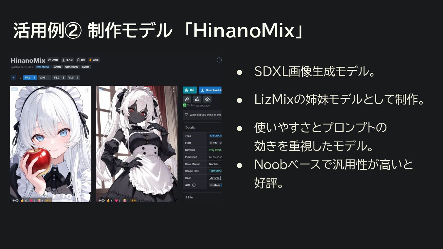 活用例② 制作モデル 「HinanoMix」 • SDXL画像生成モデル。 • LizMixの姉妹モデルとして制作。 • 使いやすさとプロンプトの 効きを重視したモデル。 •
