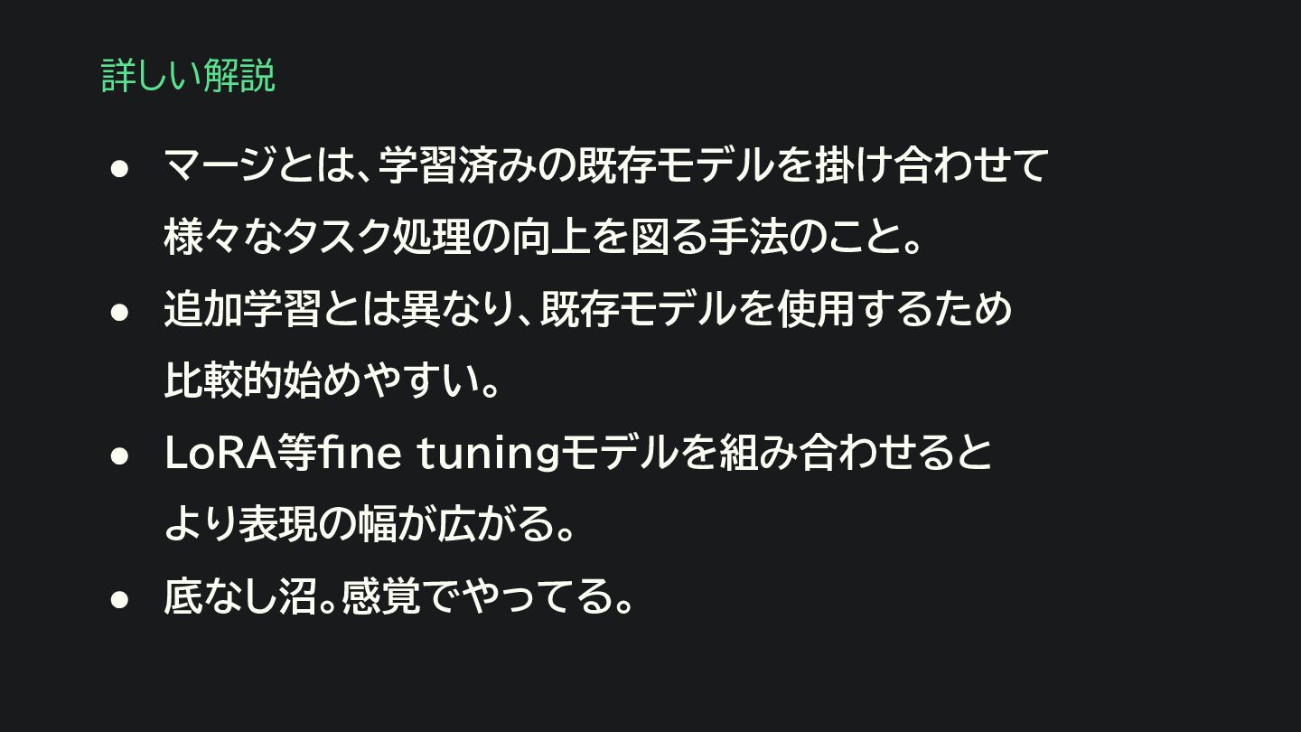 • マージとは、学習済みの既存モデルを掛け合わせて 様々なタスク処理の向上を図る手法のこと。 • 追加学習とは異なり、既存モデルを使用するため 比較的始めやすい。 • LoRA等fine tuningモデルを組み合わせると より表現の幅が広がる。