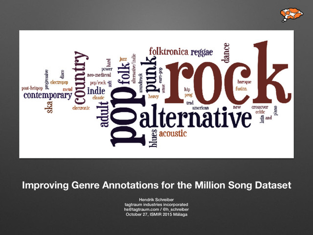 Pop (0.052) Alternative/Punk (0.036) Pop (0.061) Soul (0.036) R&B/Soul (0.033) Rock (0.024) Pop (0.022) Game (0.011) ... ... ... d their top four co-occurring labels ordered by relative strength given in ccurrence matrix C were computed taking only submissions by English unt. genre of (4) ents, we ed trees properly roved to se trees z, Pop, mple, the he root. nk, and an itself f is low a genre, r a root- Rock Metal Alternative Punk ... Pop Folk Pop Acoustic Pop Top 40 ... Hip-Hop East Coast Rap Turntablism ... RnB Motown Funk Soul Urban ... Figure 1. Partial, generated trees for the seed-genres Rock, Pop, Hip-Hop, and R&B. (2) Because this rule allows a genre to be a sub-genre of multiple genres, we add: a is a direct sub-genre of b, iff a is a sub-genre of b ^ C a,b > C a,c with c 6= a ^ c 6= b; a, b, c 2 G (4) By finding all direct sub-genres and their parents, we can now create a set of trees. The number of created trees depends on the threshold ⌧. We found, that to properly distinguish between Pop and Rock, ⌧ := 0.085 proved to be useful, resulting in 141 trees. The roots of these trees are typically the names of seed-genres like Jazz, Pop, Rock, etc. (see Figure 1). Not all generated trees have children. For example, the tree with the seed-genre Groove consists of just the root. Although Groove co-occurs with R&B, Rock, Funk, and Soul, the co-occurrence rates with genres other than itself are all below ⌧. Even the co-occurrence with itself is low (0.157). This suggests, that Groove is not really a genre, but more a property of a genre. Another example for a root- only tree is Calypso. Here the co-occurrence with itself is much higher (0.606) and indeed Calypso qualifies as stand-alone genre that simply does not have any sub-genres in this database. Naturally, the generated taxonomies are only simplified mappings of the more complex relationship graph repre- sented by C. In reality, genres aren’t necessarily exclusive members of one tree or another (e.g. fusion genres). An ontology is the much better construct. But, as we will see, Rock Metal Alternative Punk ... Pop Folk Pop Acoustic Pop Top 40 ... Hip-Hop East Coast Rap Turntablism ... RnB Motown Funk Soul Urban ... Figure 1. Partial, generated trees for the seed-genres Rock, Pop, Hip-Hop, and R&B. 2.4 Matching with Million Song Dataset To create song-level genre annotations for the MSD, we queried the beaTunes database for songs with artist/title pairs contained in the MSD and were able to match 677,038 songs. In order to ease the comparison with the HO and Top-MAGD datasets, we associated each matched song with the seed-genre of its most often occurring genre label, taking advantage of the taxonomies created in No parent