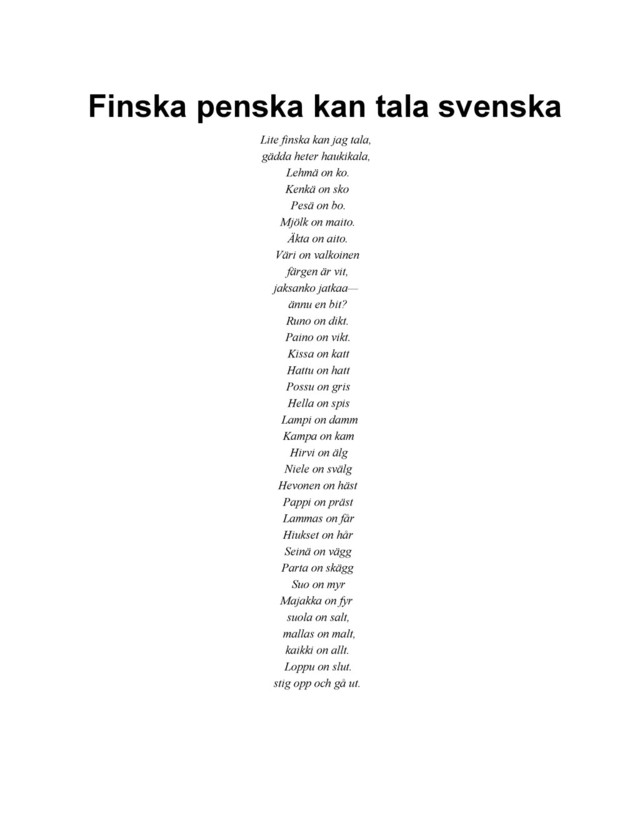 gädda heter haukikala, Lehmä on ko. Kenkä on sko Pesä on bo. Mjölk on maito. Äkta on aito. Väri on valkoinen färgen är vit, jaksanko jatkaa— ännu en bit? Runo on dikt. Paino on vikt. Kissa on katt Hattu on hatt Possu on gris Hella on spis Lampi on damm Kampa on kam Hirvi on älg Niele on svälg Hevonen on häst Pappi on präst Lammas on får Hiukset on hår Seinä on vägg Parta on skägg Suo on myr Majakka on fyr suola on salt, mallas on malt, kaikki on allt. Loppu on slut. stig opp och gå ut.
