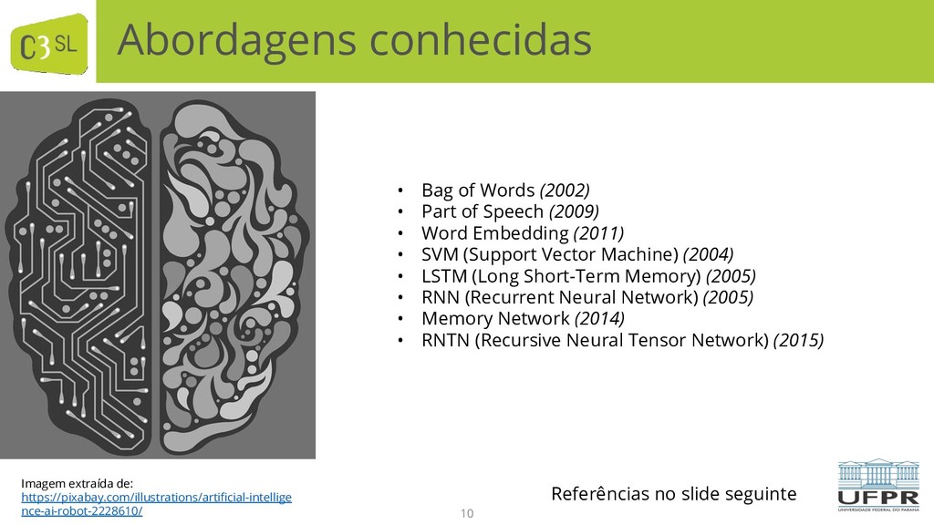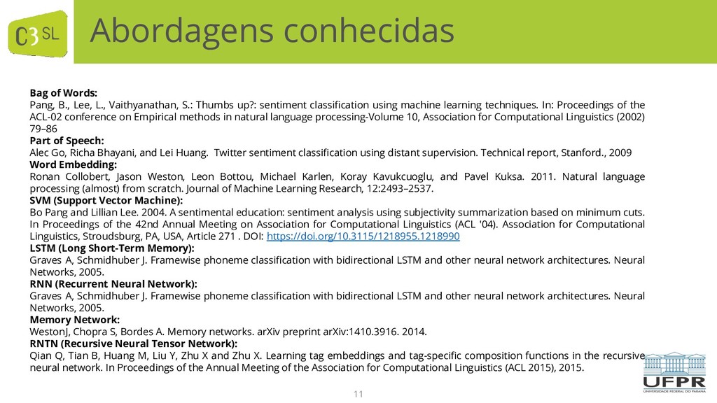 Vaithyanathan, S.: Thumbs up?: sentiment classification using machine learning techniques. In: Proceedings of the ACL-02 conference on Empirical methods in natural language processing-Volume 10, Association for Computational Linguistics (2002) 79–86 Part of Speech: Alec Go, Richa Bhayani, and Lei Huang. Twitter sentiment classification using distant supervision. Technical report, Stanford., 2009 Word Embedding: Ronan Collobert, Jason Weston, Leon Bottou, Michael Karlen, Koray Kavukcuoglu, and Pavel Kuksa. 2011. Natural language processing (almost) from scratch. Journal of Machine Learning Research, 12:2493–2537. SVM (Support Vector Machine): Bo Pang and Lillian Lee. 2004. A sentimental education: sentiment analysis using subjectivity summarization based on minimum cuts. In Proceedings of the 42nd Annual Meeting on Association for Computational Linguistics (ACL '04). Association for Computational Linguistics, Stroudsburg, PA, USA, Article 271 . DOI: https://doi.org/10.3115/1218955.1218990 LSTM (Long Short-Term Memory): Graves A, Schmidhuber J. Framewise phoneme classification with bidirectional LSTM and other neural network architectures. Neural Networks, 2005. RNN (Recurrent Neural Network): Graves A, Schmidhuber J. Framewise phoneme classification with bidirectional LSTM and other neural network architectures. Neural Networks, 2005. Memory Network: WestonJ, Chopra S, Bordes A. Memory networks. arXiv preprint arXiv:1410.3916. 2014. RNTN (Recursive Neural Tensor Network): Qian Q, Tian B, Huang M, Liu Y, Zhu X and Zhu X. Learning tag embeddings and tag-specific composition functions in the recursive neural network. In Proceedings of the Annual Meeting of the Association for Computational Linguistics (ACL 2015), 2015.