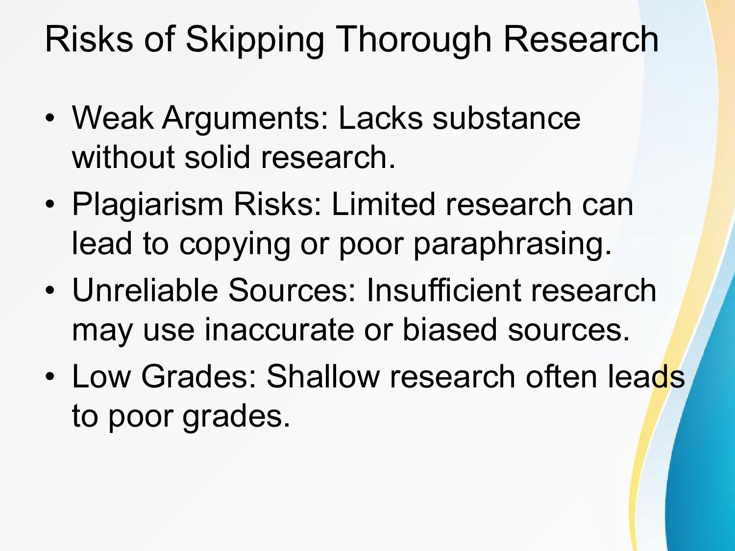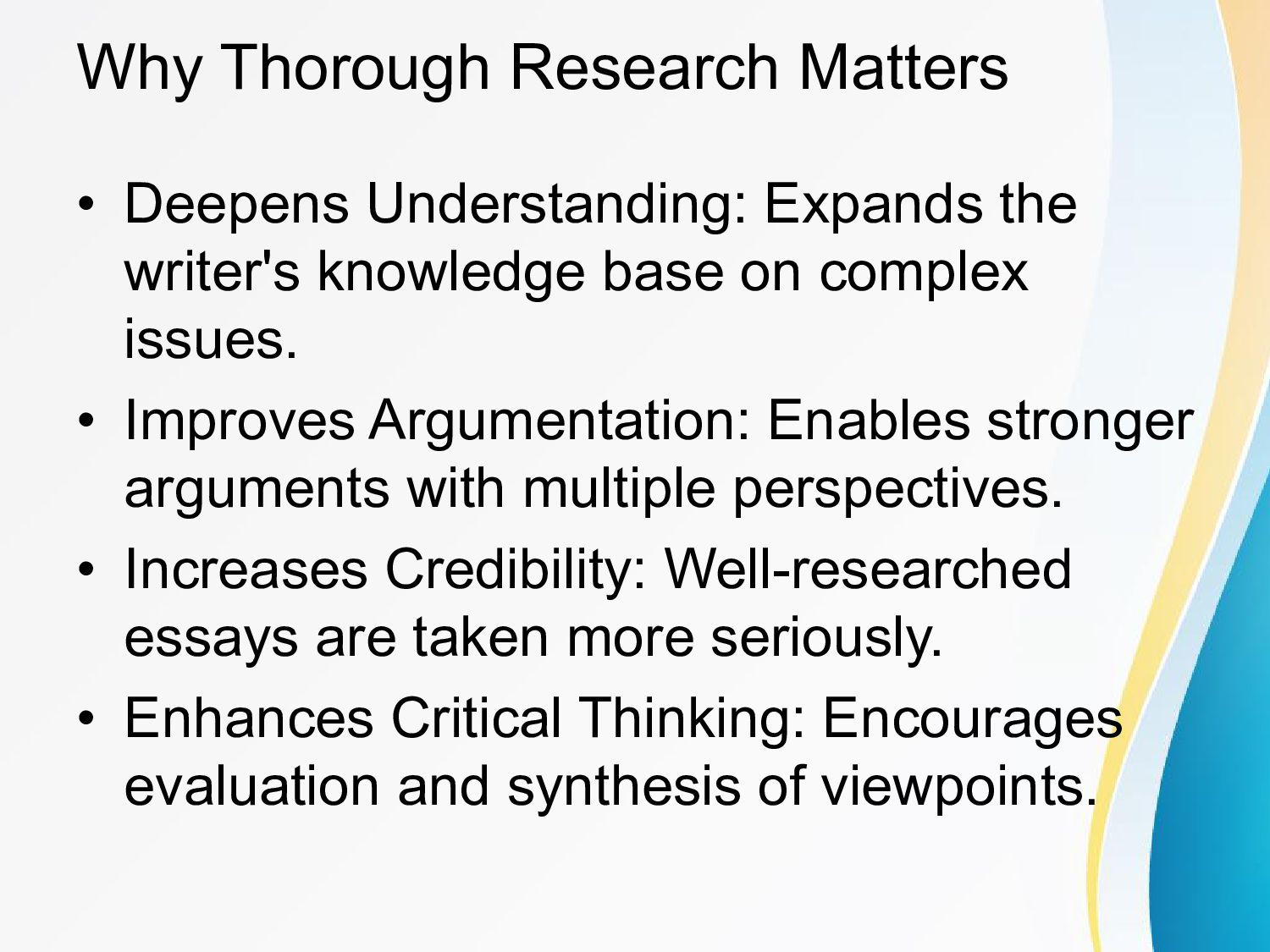 This PowerPoint presentation highlights the significance of research in the essay-writing process. It covers the role of research in building a strong argument, the benefits of thorough research, the risks of inadequate preparation, and practical tips for conducting effective research. Through concise slides, it emphasizes the importance of credibility, critical thinking, and using credible sources to craft high-quality essays.