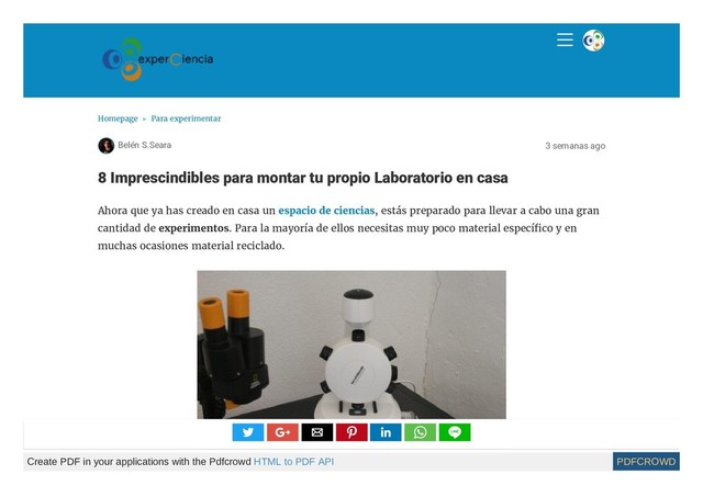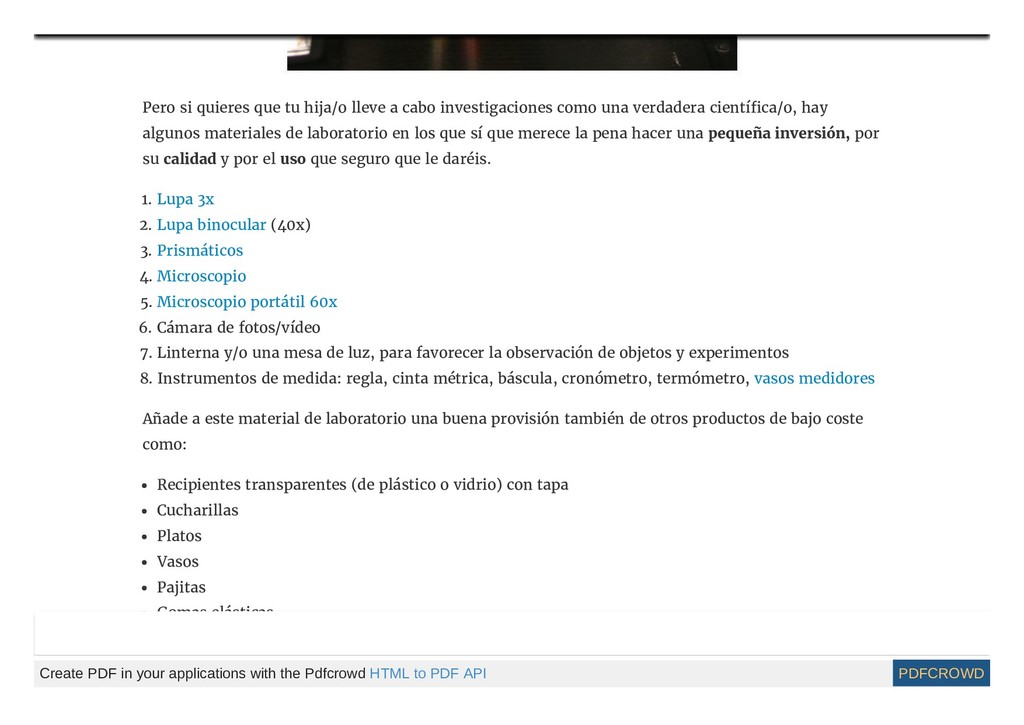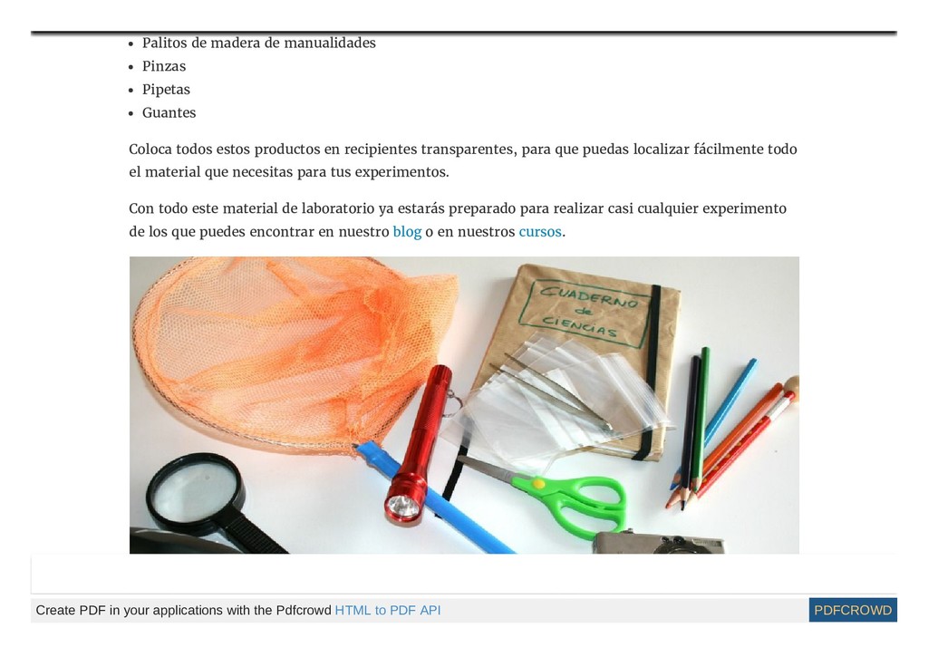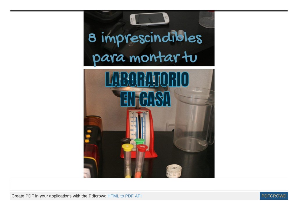 para montar tu propio Laboratorio en casa Ahora que ya has creado en casa un espacio de ciencias, estás preparado para llevar a cabo una gran cantidad de experimentos. Para la mayoría de ellos necesitas muy poco material específico y en muchas ocasiones material reciclado. ► Create PDF in your applications with the Pdfcrowd HTML to PDF API PDFCROWD