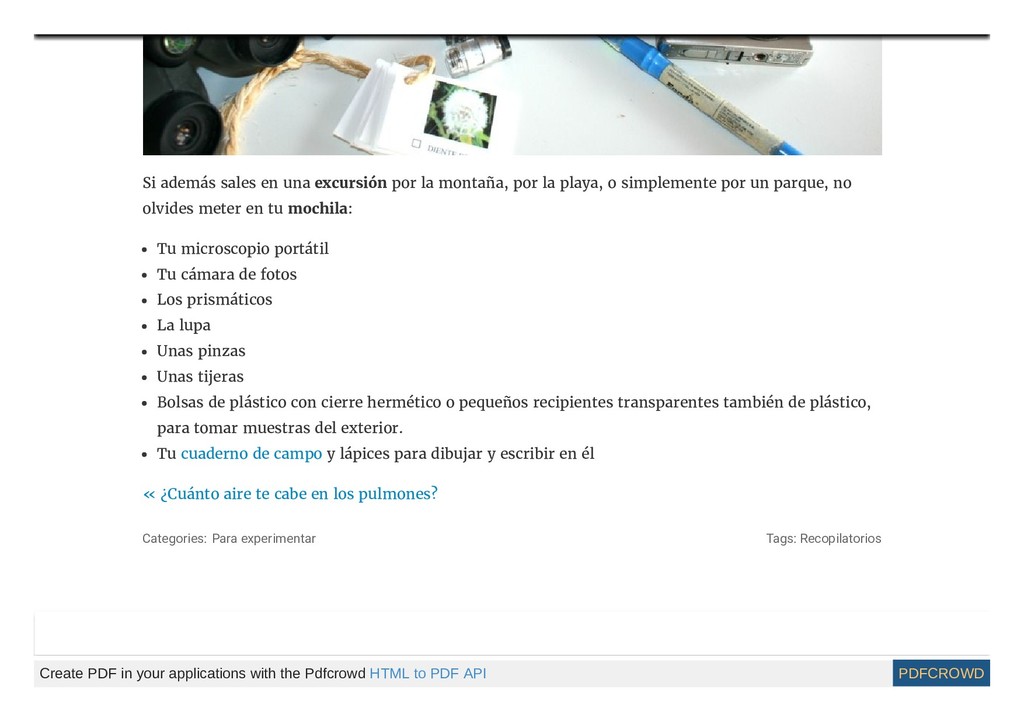 la playa, o simplemente por un parque, no olvides meter en tu mochila: Tu microscopio portátil Tu cámara de fotos Los prismáticos La lupa Unas pinzas Unas tijeras Bolsas de plástico con cierre hermético o pequeños recipientes transparentes también de plástico, para tomar muestras del exterior. Tu cuaderno de campo y lápices para dibujar y escribir en él « ¿Cuánto aire te cabe en los pulmones? Categories: Para experimentar Tags: Recopilatorios Create PDF in your applications with the Pdfcrowd HTML to PDF API PDFCROWD