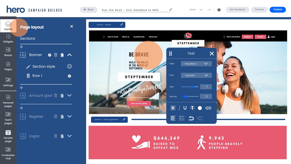 Headline 1 Font Oswald Size 7 Spacing 2 S T E P T E M B E R #KissGoodbyeToMDS BE BRAVE WALK 100 MILES IN THE MONTH OF SEPTEMBER, R E G I S T E R N O W Text C A M P A I G N B U I L D E R Fundraising widgets Text Text + Image Image Video Button Locations Thermometer Leaderboards Section 2 - Shave registration Section 1 - Banner Layout Widgets Blocks Pages Settings Personal pages Team pages Fundraiser HUB Donate page