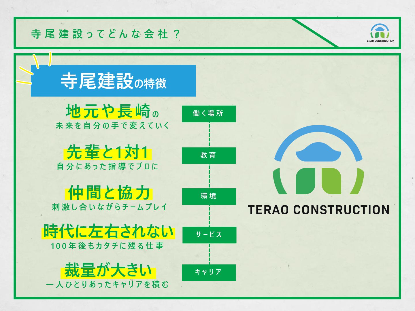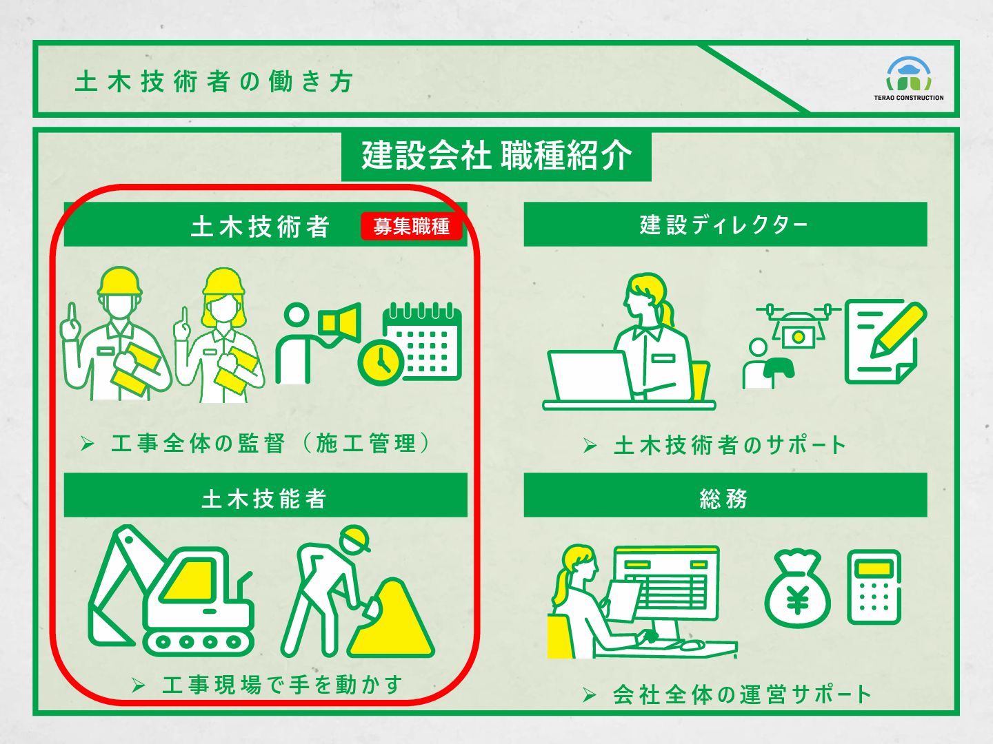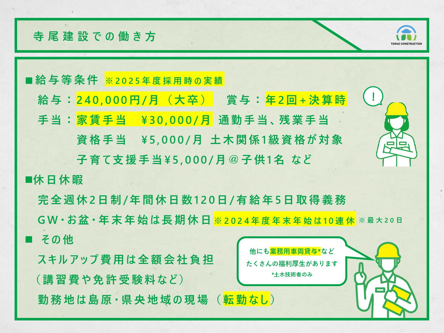 給 与 等 条 件 ※ 2 0 2 5 年 度 採 用 時 の 実 績 給 与 : 2 4 0 , 0 0 0 円 / 月 ( 大 卒 ) 賞 与 : 年 2 回 + 決 算 時 手 当 : 家 賃 手 当 ¥ 3 0 , 0 0 0 / 月 通 勤 手 当 、 残 業 手 当 資 格 手 当 ¥ 5 , 0 0 0 / 月 土 木 関 係 1 級 資 格 が 対 象 子 育 て 支 援 手 当 ¥ 5 , 0 0 0 / 月 @ 子 供 1 名 な ど ◼休 日 休 暇 完 全 週 休 2 日 制 / 年 間 休 日 数 1 2 0 日 / 有 給 年 5 日 取 得 義 務 G W ・ お 盆 ・ 年 末 年 始 は 長 期 休 日 ※ 2 0 2 4 年 度 年 末 年 始 は 1 0 連 休 ◼ そ の 他 ス キ ル ア ッ プ 費 用 は 全 額 会 社 負 担 ( 講 習 費 や 免 許 受 験 料 な ど ) 勤 務 地 は 島 原 ・ 県 央 地 域 の 現 場 ( 転 勤 な し ) ※ 最 大 2 0 日 他にも業務用車両貸与*など たくさんの福利厚生があります *土木技術者のみ !