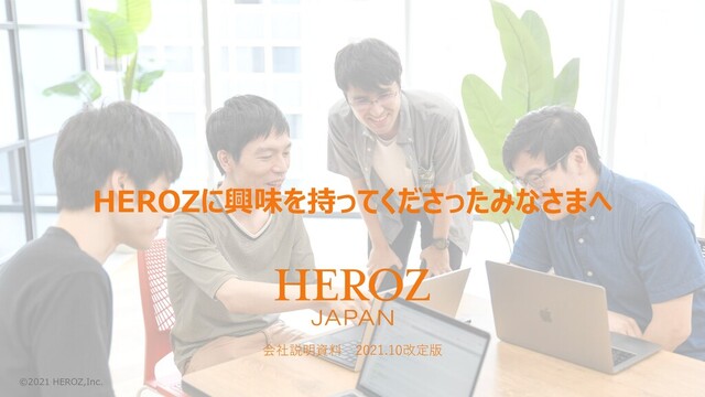 ・都営地下鉄「三⽥」駅A3出⼝ 徒歩1分 設⽴ 2009年4⽉ 代表取締役 林 隆弘・⾼橋 知裕 事業内容 AI技術を活⽤したサービスの企画・開発・運⽤ AI(BtoBサービス)「HEROZ Kishin」 AI(BtoCサービス)「将棋ウォーズ」等 上場株式市場 東京証券取引市場第⼀部(2019年12⽉) 加盟団体 ⽇本ディープラーニング協会, ⼈⼯知能学会, FinTech協会 代表取締役 Co-CEO 林 隆弘 早稲⽥⼤学卒 ⽇本電気株式会社(NEC)技術開発職⼊社 IT戦略部、経営企画部に在籍 HEROZ株式会社 設⽴ 代表取締役 Co-CEO ⾼橋 知裕 早稲⽥⼤学卒 ⽇本電気株式会社(NEC)技術開発職⼊社 BIGLOBE、経営企画部に在籍 HEROZ株式会社 設⽴ 取締役 COO 浅原 ⼤輔 京都⼤学⼤学院卒 / ペンシルベニア⼤学ウォートンスクールMBA マーサージャパン株式会社 ゴールドマン・サックス株式会社 投資銀⾏部⾨資本市場本部に在籍 HEROZ株式会社 ⼊社 取締役 CTO 井⼝ 圭⼀ 東京⼯業⼤学⼤学院卒 ⽇本電気株式会社(NEC)中央研究所に在籍 HEROZ株式会社 ⼊社