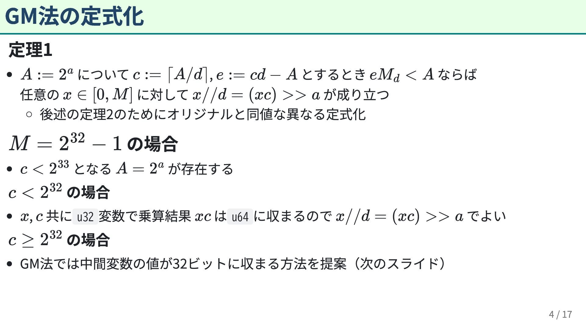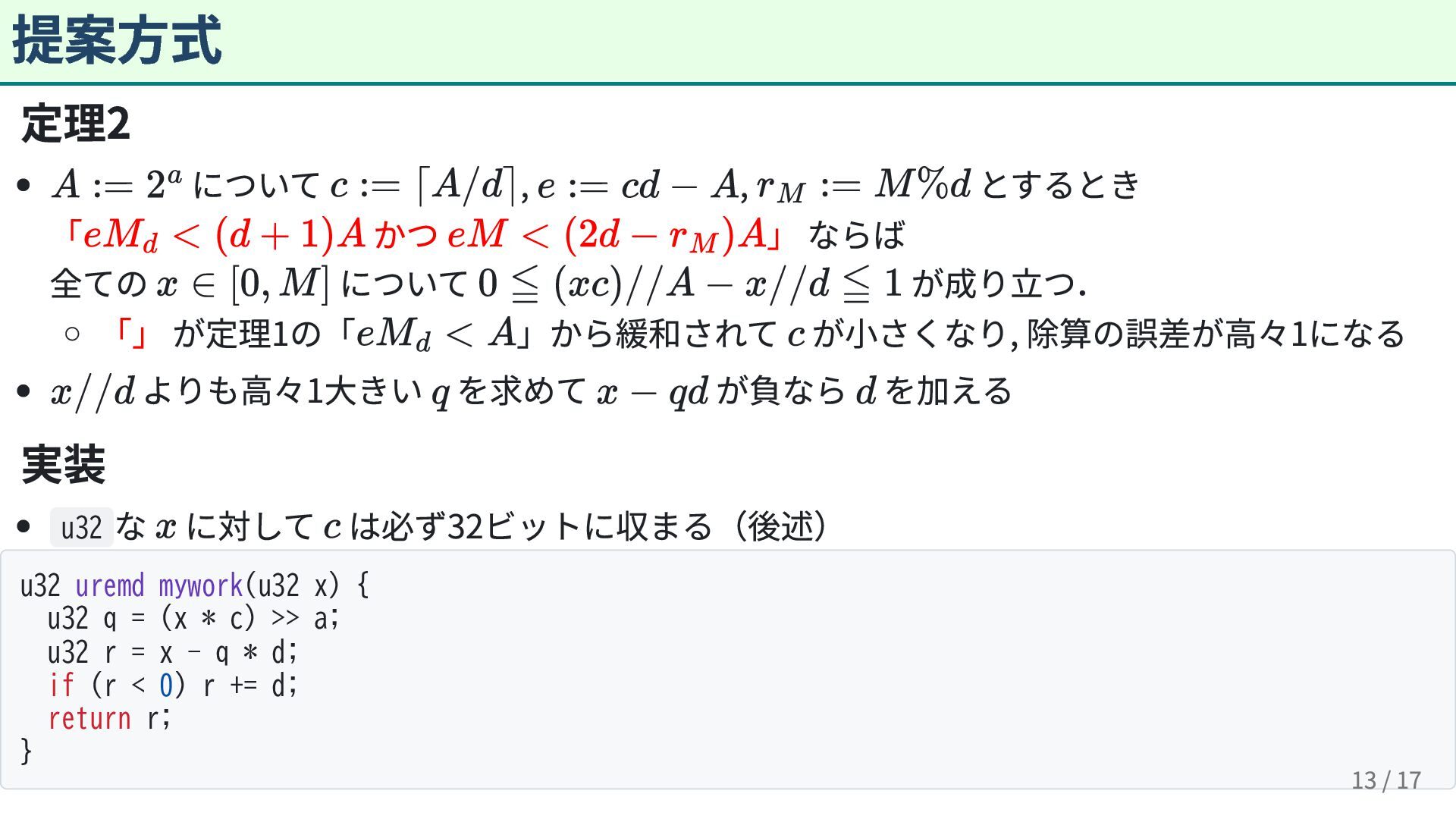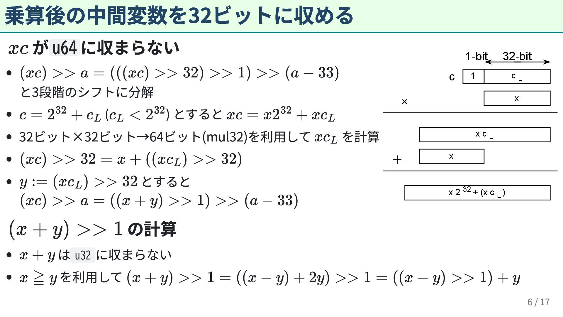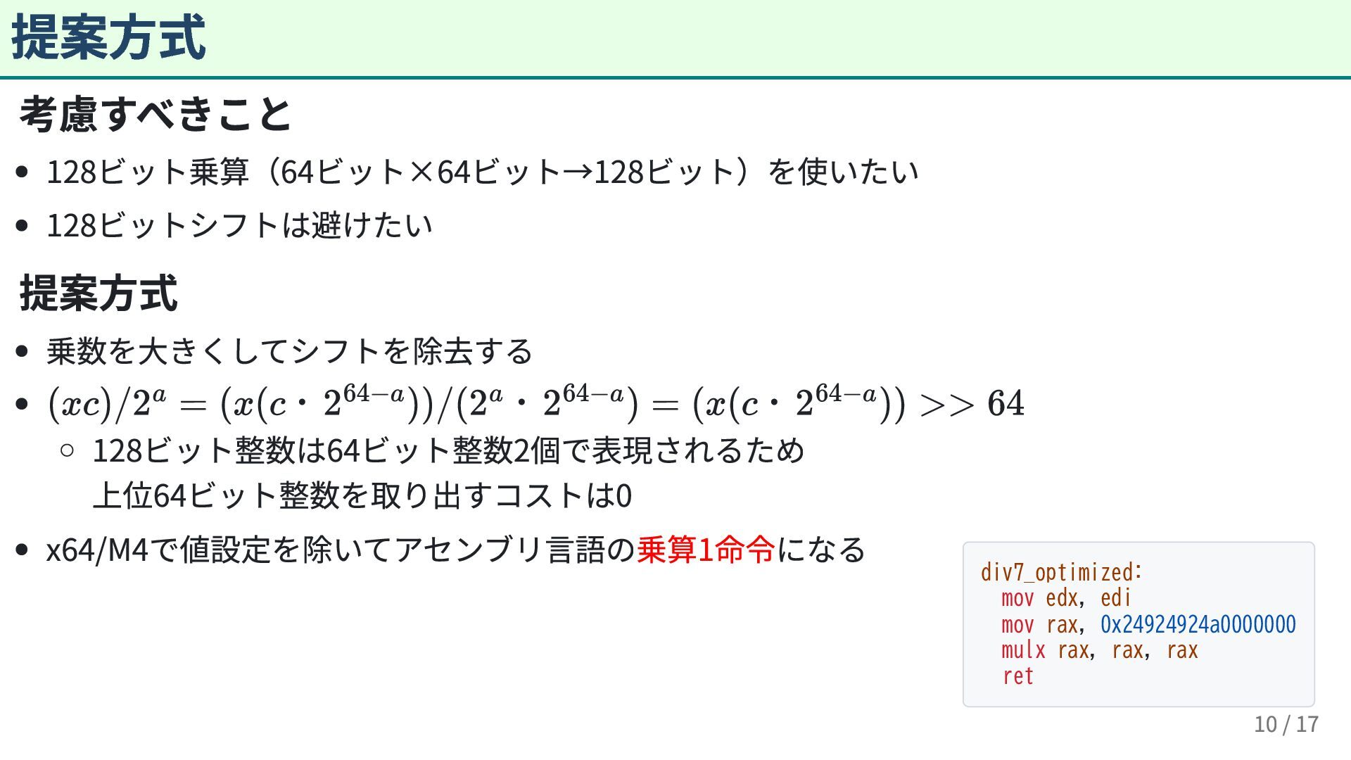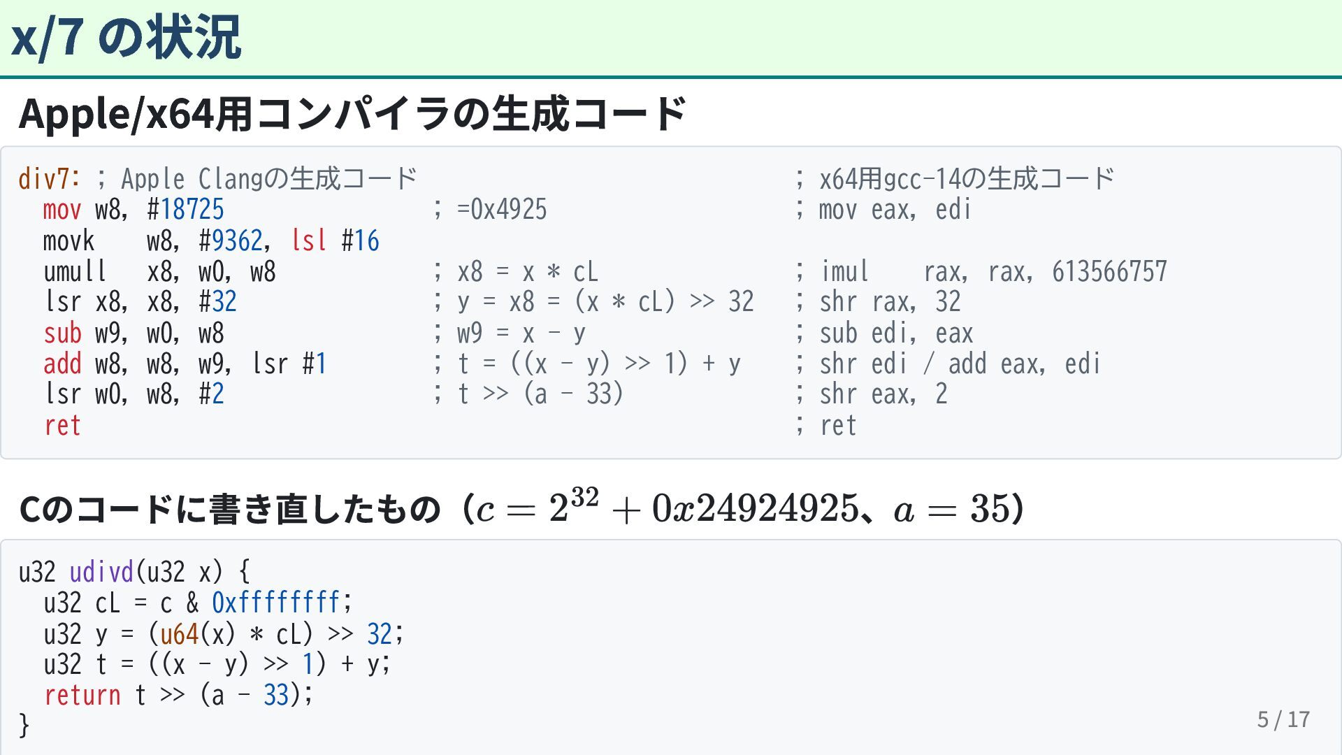 w8, #18725 ; =0x4925 ; mov eax, edi movk w8, #9362, lsl #16 umull x8, w0, w8 ; x8 = x * cL ; imul rax, rax, 613566757 lsr x8, x8, #32 ; y = x8 = (x * cL) >> 32 ; shr rax, 32 sub w9, w0, w8 ; w9 = x - y ; sub edi, eax add w8, w8, w9, lsr #1 ; t = ((x - y) >> 1) + y ; shr edi / add eax, edi lsr w0, w8, #2 ; t >> (a - 33) ; shr eax, 2 ret ; ret Cのコードに書き直したもの( 、 ) u32 udivd(u32 x) { u32 cL = c & 0xffffffff; u32 y = (u64(x) * cL) >> 32; u32 t = ((x - y) >> 1) + y; return t >> (a - 33); } 5 / 17