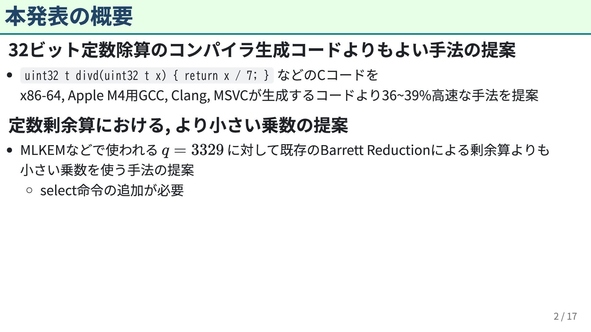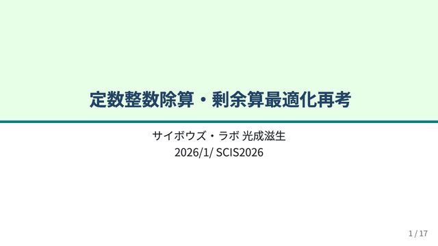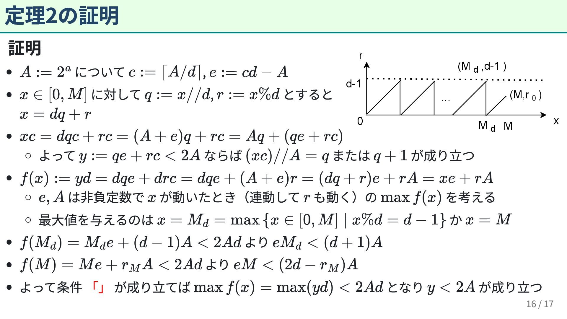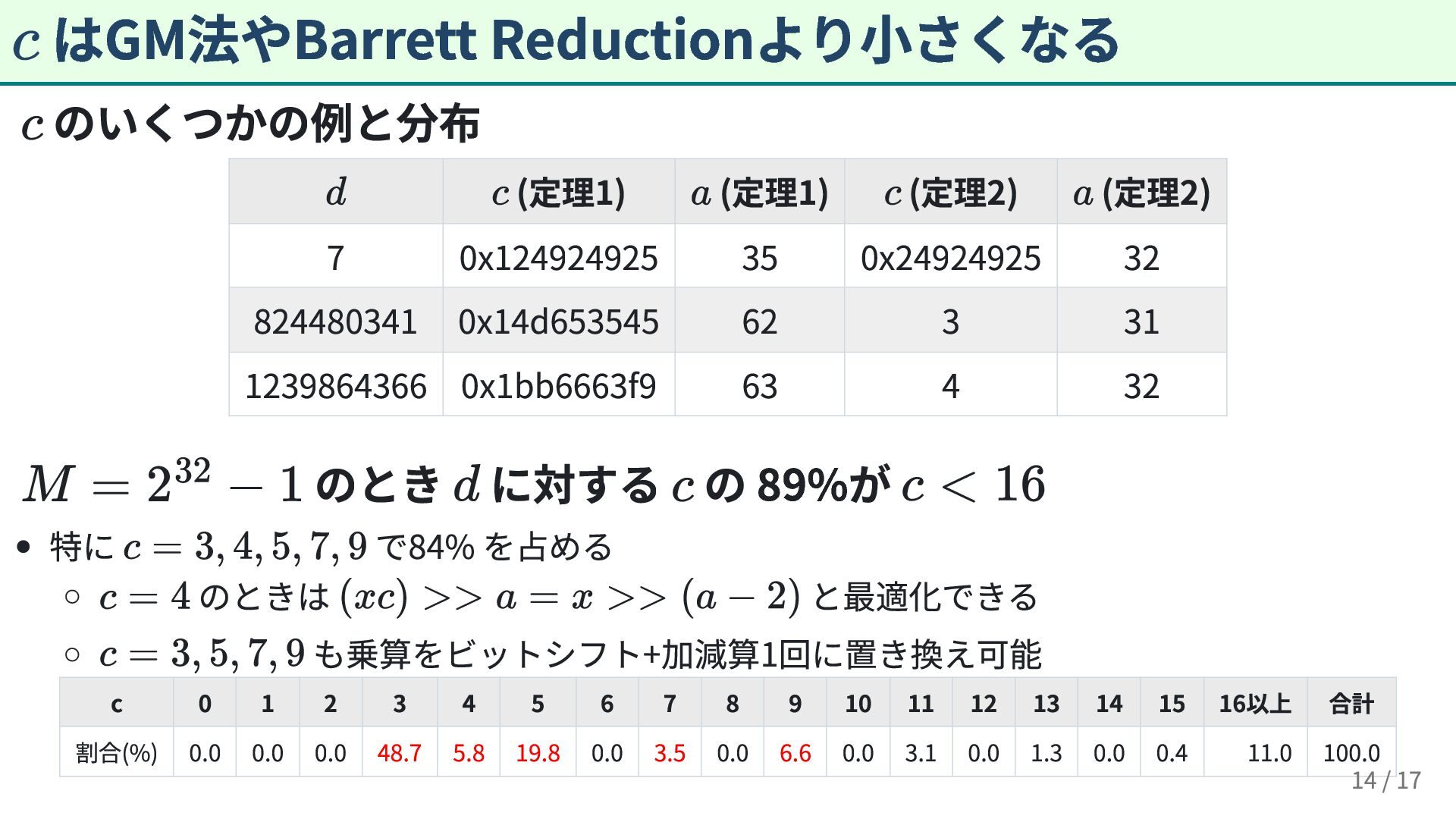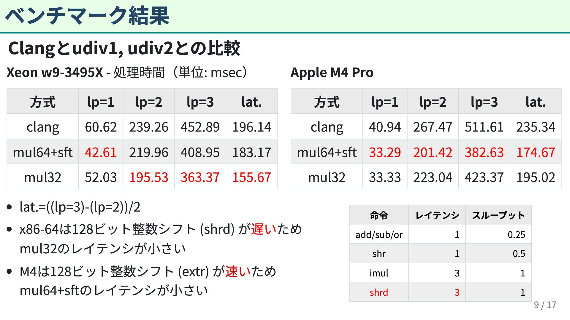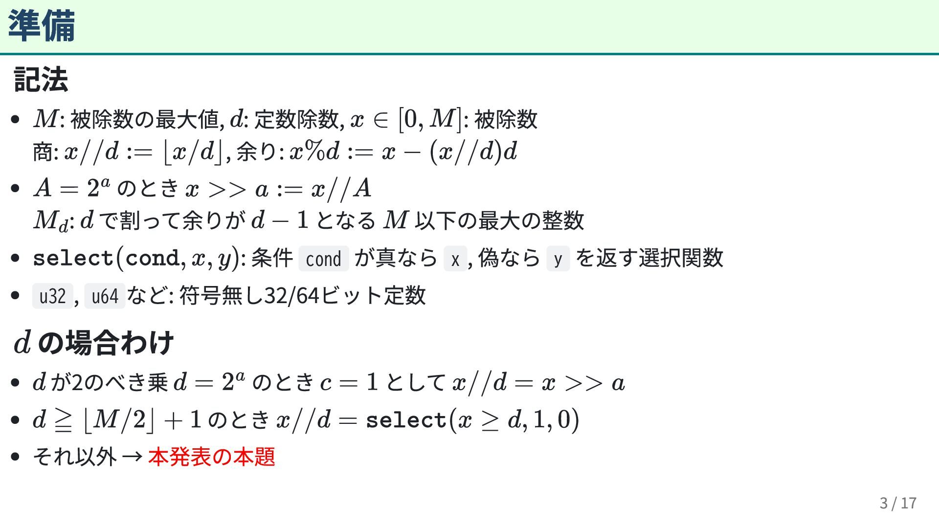 w8, #18725 ; =0x4925 ; mov eax, edi movk w8, #9362, lsl #16 umull x8, w0, w8 ; x8 = x * cL ; imul rax, rax, 613566757 lsr x8, x8, #32 ; y = x8 = (x * cL) >> 32 ; shr rax, 32 sub w9, w0, w8 ; w9 = x - y ; sub edi, eax add w8, w8, w9, lsr #1 ; t = ((x - y) >> 1) + y ; shr edi / add eax, edi lsr w0, w8, #2 ; t >> (a - 33) ; shr eax, 2 ret ; ret Cのコードに書き直したもの( 、 ) u32 udivd(u32 x) { u32 cL = c & 0xffffffff; u32 y = (u64(x) * cL) >> 32; u32 t = ((x - y) >> 1) + y; return t >> (a - 33); } 5 / 17