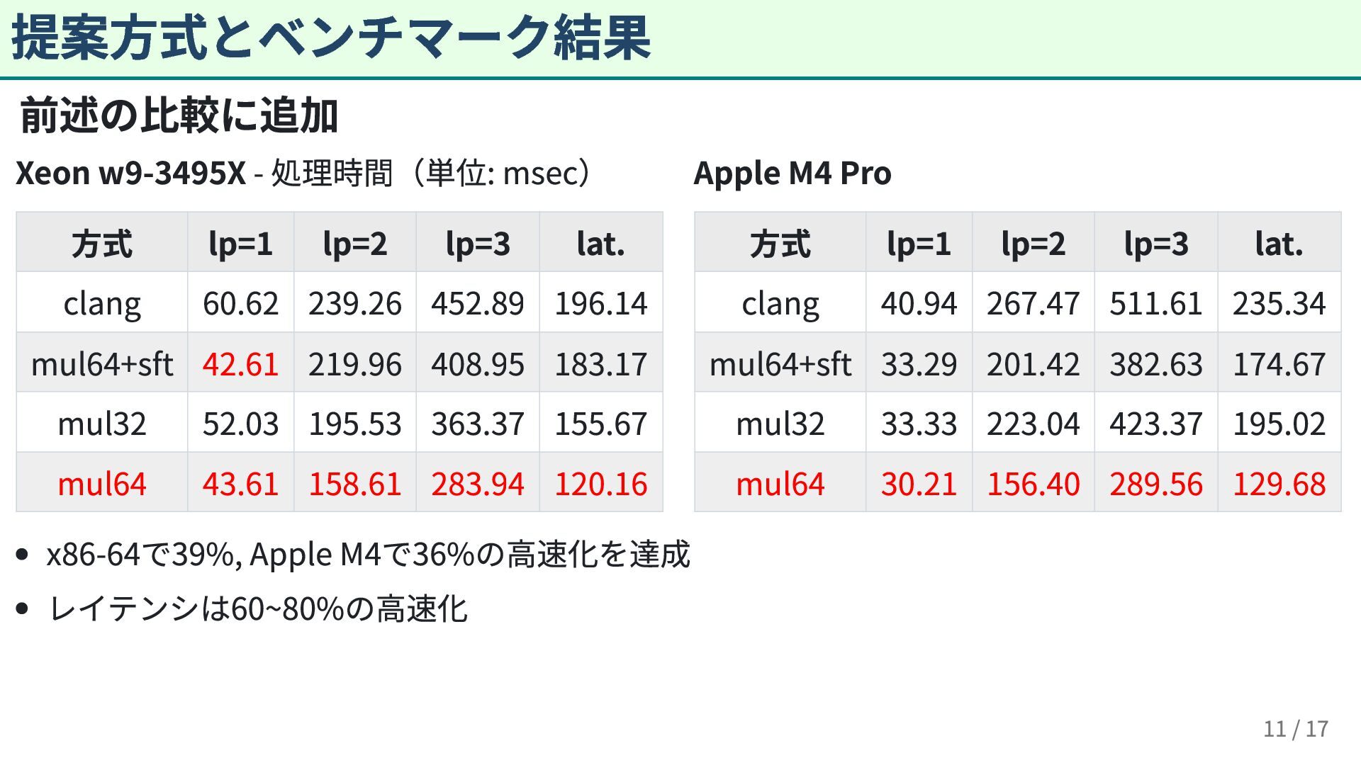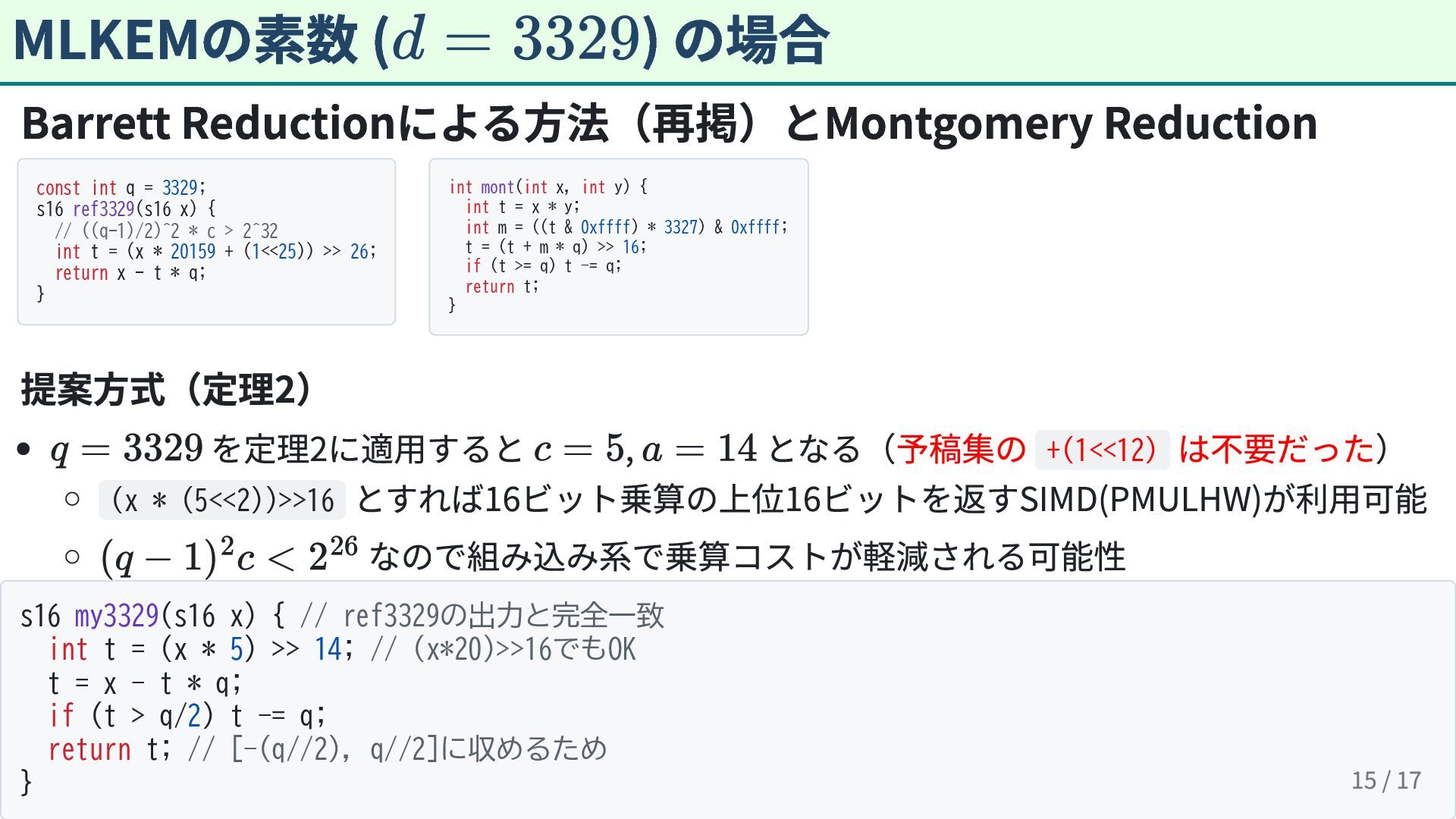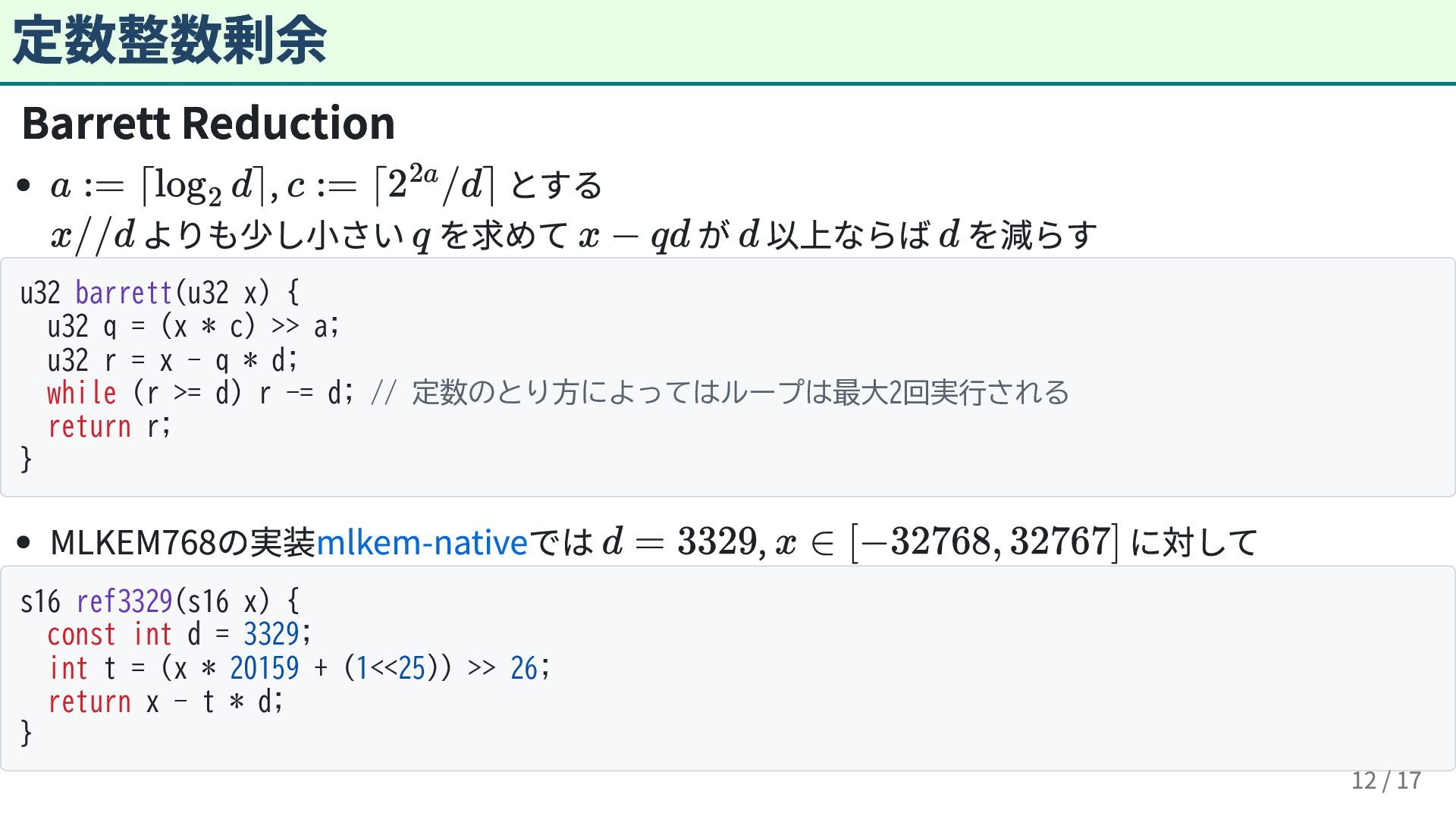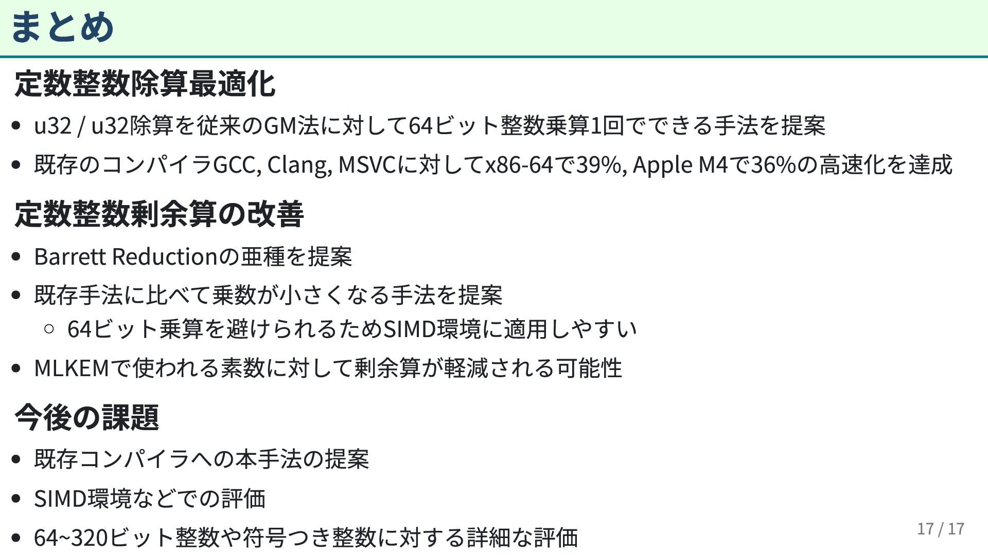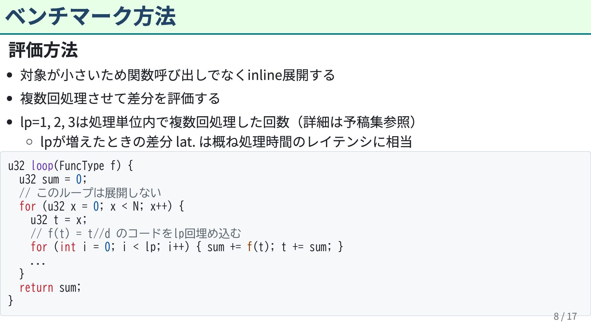 w8, #18725 ; =0x4925 ; mov eax, edi movk w8, #9362, lsl #16 umull x8, w0, w8 ; x8 = x * cL ; imul rax, rax, 613566757 lsr x8, x8, #32 ; y = x8 = (x * cL) >> 32 ; shr rax, 32 sub w9, w0, w8 ; w9 = x - y ; sub edi, eax add w8, w8, w9, lsr #1 ; t = ((x - y) >> 1) + y ; shr edi / add eax, edi lsr w0, w8, #2 ; t >> (a - 33) ; shr eax, 2 ret ; ret Cのコードに書き直したもの( 、 ) u32 udivd(u32 x) { u32 cL = c & 0xffffffff; u32 y = (u64(x) * cL) >> 32; u32 t = ((x - y) >> 1) + y; return t >> (a - 33); } 5 / 17