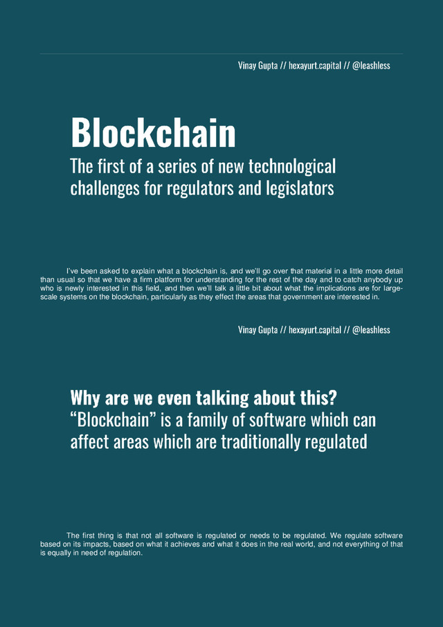 we’ll go over that material in a little more detail than usual so that we have a firm platform for understanding for the rest of the day and to catch anybody up who is newly interested in this field, and then we’ll talk a little bit about what the implications are for large- scale systems on the blockchain, particularly as they effect the areas that government are interested in. The first thing is that not all software is regulated or needs to be regulated. We regulate software based on its impacts, based on what it achieves and what it does in the real world, and not everything of that is equally in need of regulation.