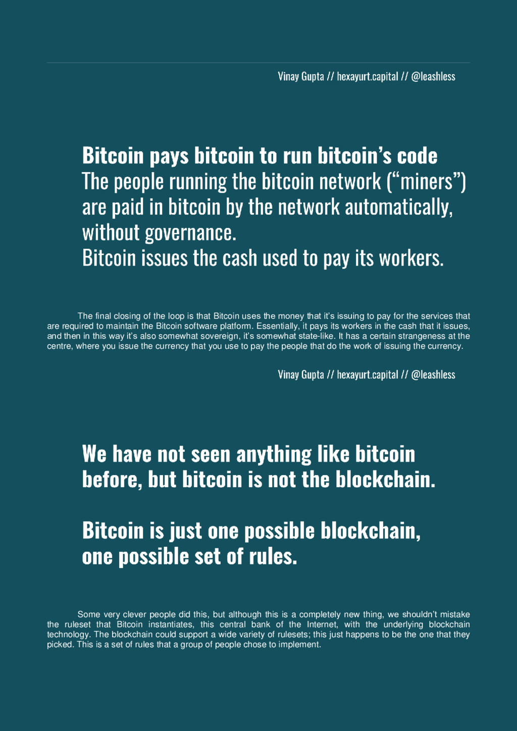 the money that it’s issuing to pay for the services that are required to maintain the Bitcoin software platform. Essentially, it pays its workers in the cash that it issues, and then in this way it’s also somewhat sovereign, it’s somewhat state-like. It has a certain strangeness at the centre, where you issue the currency that you use to pay the people that do the work of issuing the currency. Some very clever people did this, but although this is a completely new thing, we shouldn’t mistake the ruleset that Bitcoin instantiates, this central bank of the Internet, with the underlying blockchain technology. The blockchain could support a wide variety of rulesets; this just happens to be the one that they picked. This is a set of rules that a group of people chose to implement.