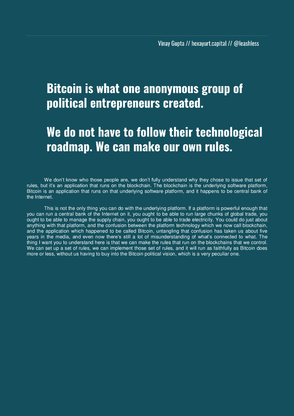 understand why they chose to issue that set of rules, but it’s an application that runs on the blockchain. The blockchain is the underlying software platform, Bitcoin is an application that runs on that underlying software platform, and it happens to be central bank of the Internet. This is not the only thing you can do with the underlying platform. If a platform is powerful enough that you can run a central bank of the Internet on it, you ought to be able to run large chunks of global trade, you ought to be able to manage the supply chain, you ought to be able to trade electricity. You could do just about anything with that platform, and the confusion between the platform technology which we now call blockchain, and the application which happened to be called Bitcoin, untangling that confusion has taken us about five years in the media, and even now there’s still a lot of misunderstanding of what’s connected to what. The thing I want you to understand here is that we can make the rules that run on the blockchains that we control. We can set up a set of rules, we can implement those set of rules, and it will run as faithfully as Bitcoin does more or less, without us having to buy into the Bitcoin political vision, which is a very peculiar one.