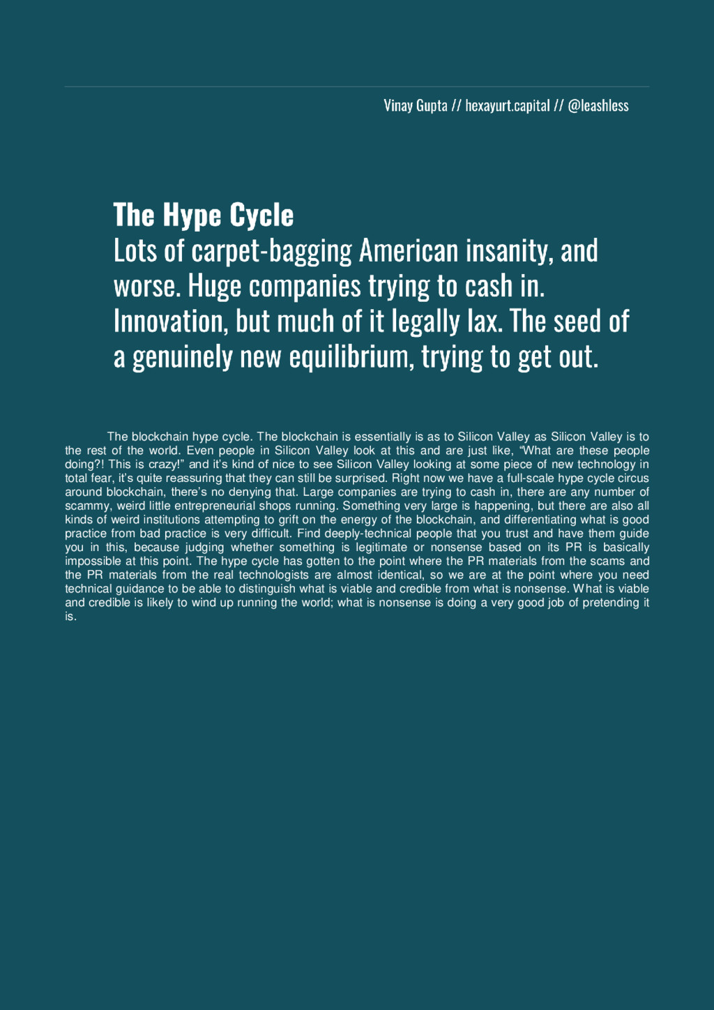 to Silicon Valley as Silicon Valley is to the rest of the world. Even people in Silicon Valley look at this and are just like, “What are these people doing?! This is crazy!” and it’s kind of nice to see Silicon Valley looking at some piece of new technology in total fear, it’s quite reassuring that they can still be surprised. Right now we have a full-scale hype cycle circus around blockchain, there’s no denying that. Large companies are trying to cash in, there are any number of scammy, weird little entrepreneurial shops running. Something very large is happening, but there are also all kinds of weird institutions attempting to grift on the energy of the blockchain, and differentiating what is good practice from bad practice is very difficult. Find deeply-technical people that you trust and have them guide you in this, because judging whether something is legitimate or nonsense based on its PR is basically impossible at this point. The hype cycle has gotten to the point where the PR materials from the scams and the PR materials from the real technologists are almost identical, so we are at the point where you need technical guidance to be able to distinguish what is viable and credible from what is nonsense. What is viable and credible is likely to wind up running the world; what is nonsense is doing a very good job of pretending it is.