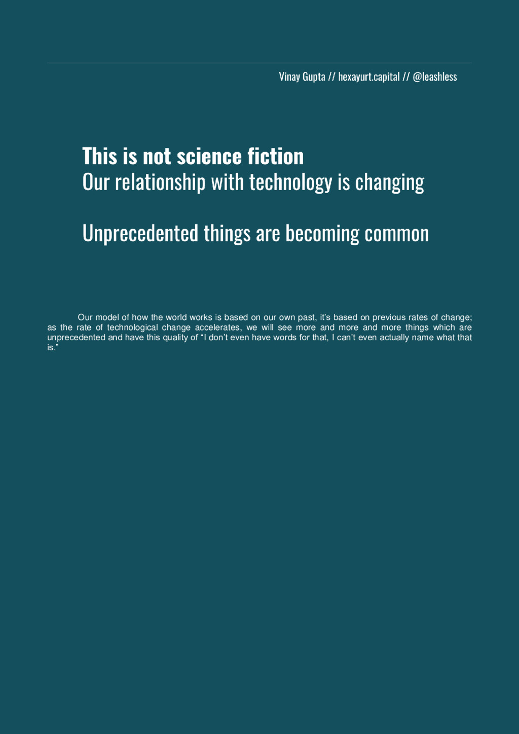 our own past, it’s based on previous rates of change; as the rate of technological change accelerates, we will see more and more and more things which are unprecedented and have this quality of “I don’t even have words for that, I can’t even actually name what that is.”