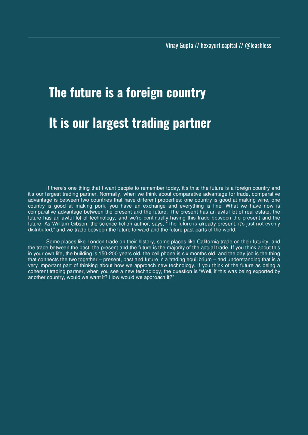 today, it’s this: the future is a foreign country and it’s our largest trading partner. Normally, when we think about comparative advantage for trade, comparative advantage is between two countries that have different properties: one country is good at making wine, one country is good at making pork, you have an exchange and everything is fine. What we have now is comparative advantage between the present and the future. The present has an awful lot of real estate, the future has an awful lot of technology, and we’re continually having this trade between the present and the future. As William Gibson, the science fiction author, says, “The future is already present, it’s just not evenly distributed,” and we trade between the future forward and the future past parts of the world. Some places like London trade on their history, some places like California trade on their futurity, and the trade between the past, the present and the future is the majority of the actual trade. If you think about this in your own life, the building is 150-200 years old, the cell phone is six months old, and the day job is the thing that connects the two together – present, past and future in a trading equilibrium – and understanding that is a very important part of thinking about how we approach new technology. If you think of the future as being a coherent trading partner, when you see a new technology, the question is “Well, if this was being exported by another country, would we want it? How would we approach it?”