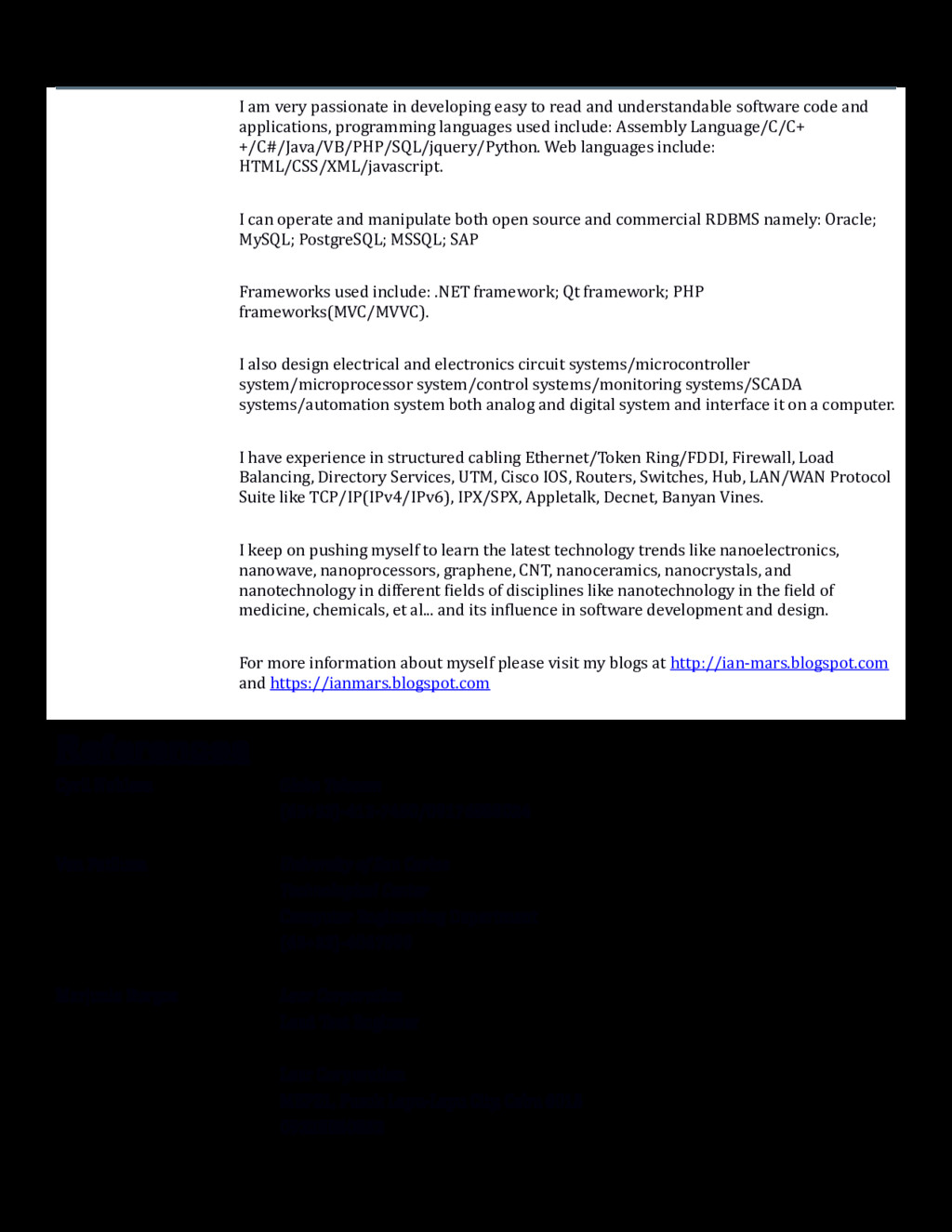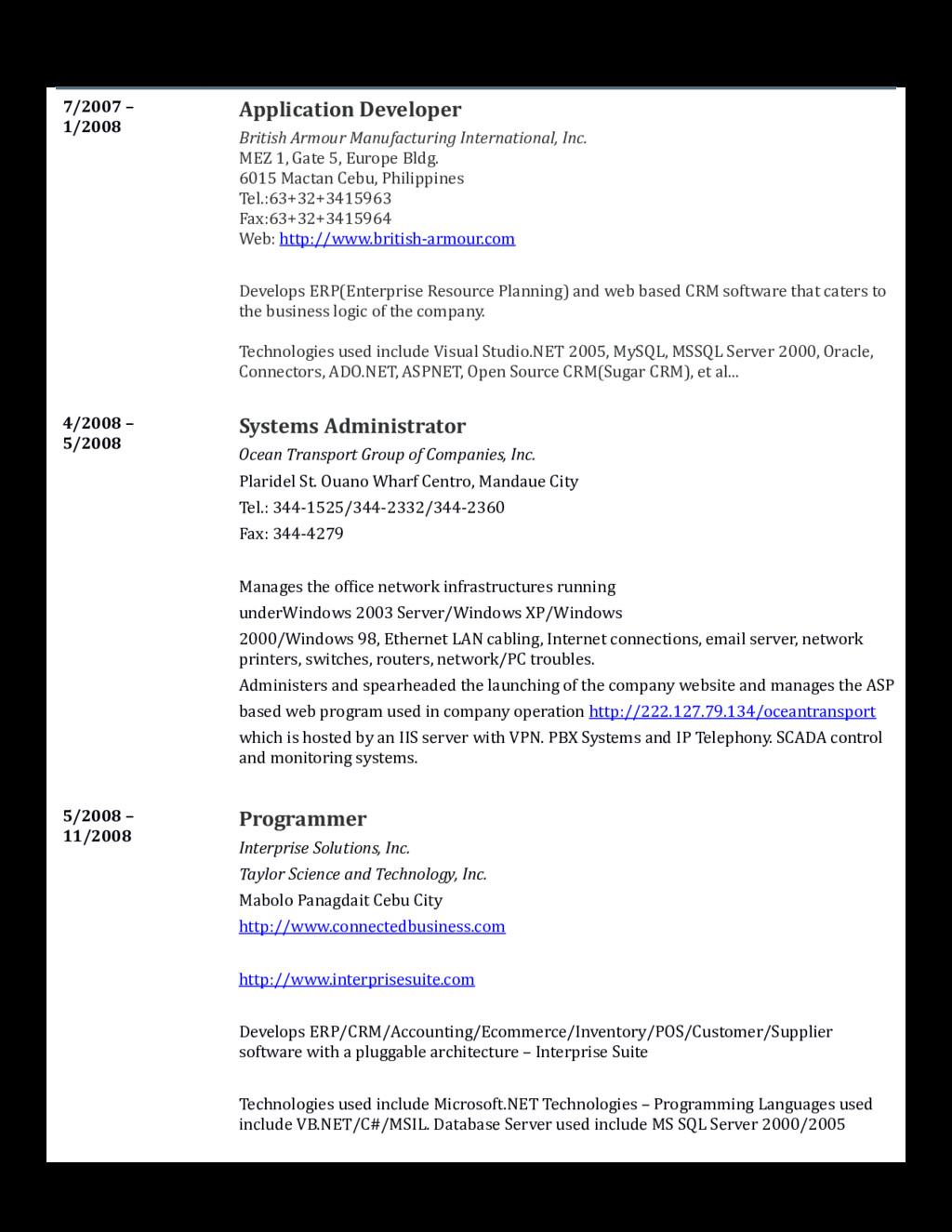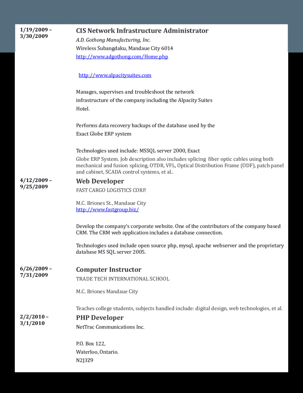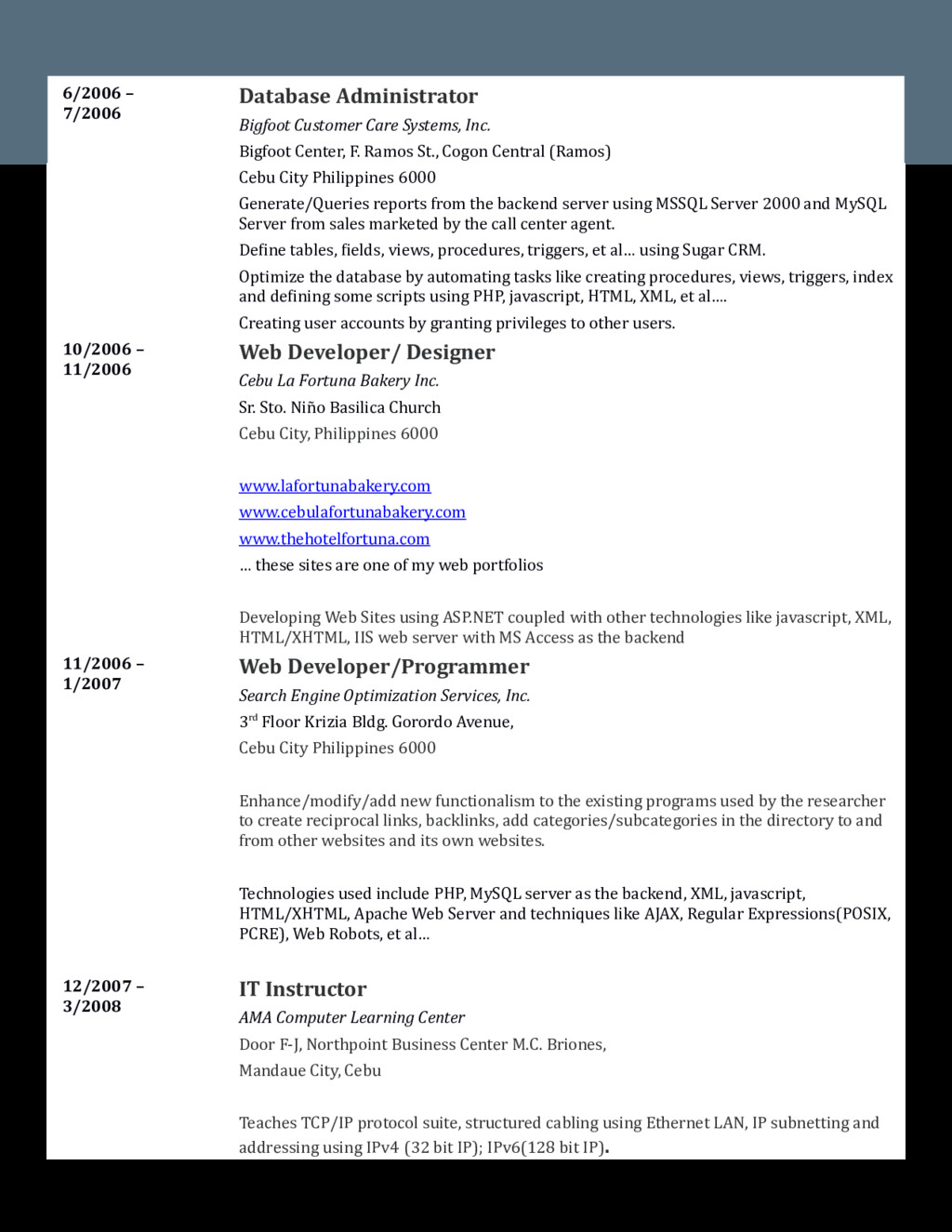 Bigfoot Center, F. Ramos St., Cogon Central (Ramos) Cebu City Philippines 6000 Generate/Queries reports from the backend server using MSSQL Server 2000 and MySQL Server from sales marketed by the call center agent. Define tables, fields, views, procedures, triggers, et al… using Sugar CRM. Optimize the database by automating tasks like creating procedures, views, triggers, index and defining some scripts using PHP, javascript, HTML, XML, et al…. Creating user accounts by granting privileges to other users. 10/2006 – 11/2006 Web Developer/ Designer Cebu La Fortuna Bakery Inc. Sr. Sto. Ninño Basilica Church Cebu City, Philippines 6000 www.lafortunabakery.com www.cebulafortunabakery.com www.thehotelfortuna.com … these sites are one of my web portfolios Developing Web Sites using ASP.NET coupled with other technologies like javascript, XML, HTML/XHTML, IIS web server with MS Access as the backend 11/2006 – 1/2007 Web Developer/Programmer Search Engine Optimization Services, Inc. 3rd Floor Krizia Bldg. Gorordo Avenue, Cebu City Philippines 6000 Enhance/modify/add new functionalism to the existing programs used by the researcher to create reciprocal links, backlinks, add categories/subcategories in the directory to and from other websites and its own websites. Technologies used include PHP, MySQL server as the backend, XML, javascript, HTML/XHTML, Apache Web Server and techniques like AJAX, Regular Expressions(POSIX, PCRE), Web Robots, et al… 12/2007 – 3/2008 IT Instructor AMA Computer Learning Center Door F-J, Northpoint Business Center M.C. Briones, Mandaue City, Cebu Teaches TCP/IP protocol suite, structured cabling using Ethernet LAN, IP subnetting and addressing using IPv4 (32 bit IP); IPv6(128 bit IP).