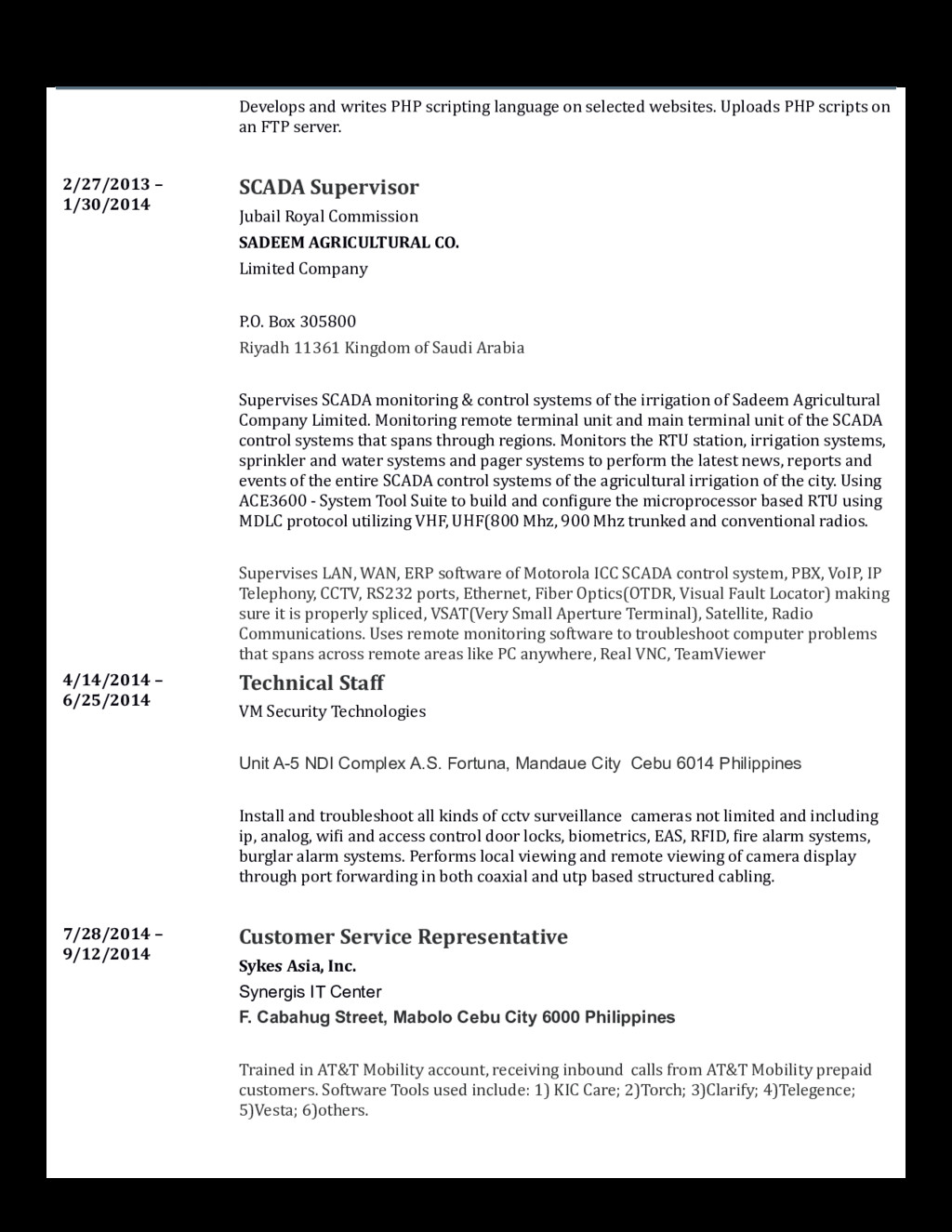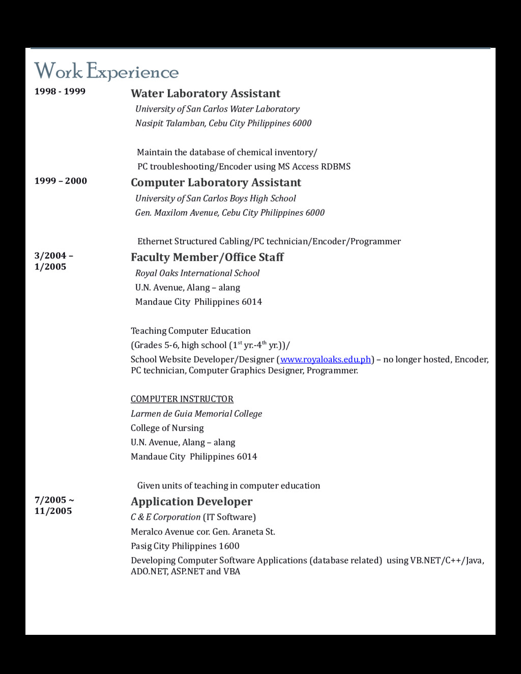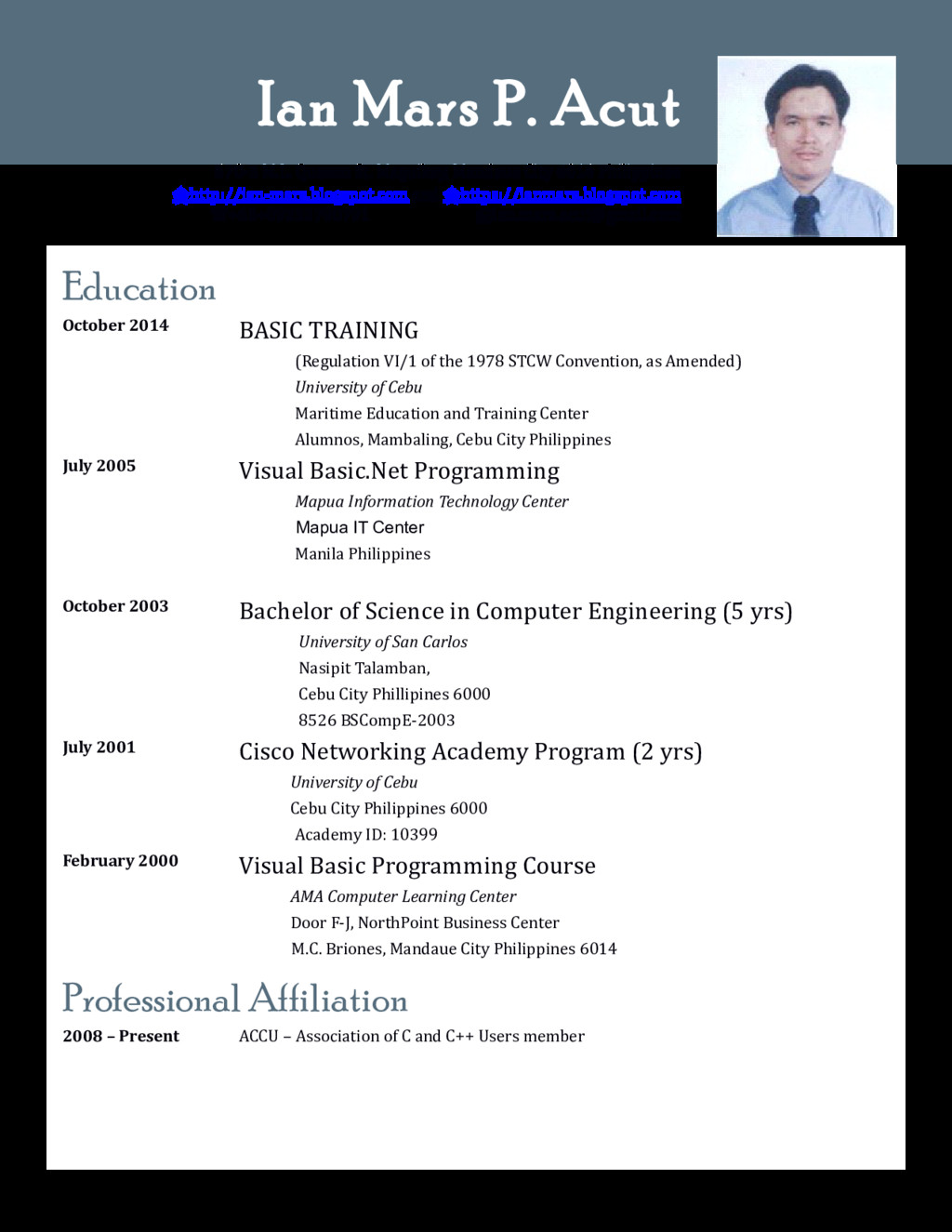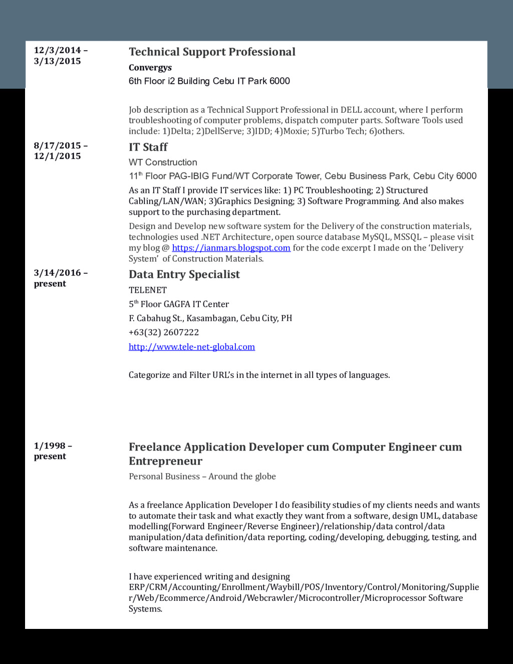 Bigfoot Center, F. Ramos St., Cogon Central (Ramos) Cebu City Philippines 6000 Generate/Queries reports from the backend server using MSSQL Server 2000 and MySQL Server from sales marketed by the call center agent. Define tables, fields, views, procedures, triggers, et al… using Sugar CRM. Optimize the database by automating tasks like creating procedures, views, triggers, index and defining some scripts using PHP, javascript, HTML, XML, et al…. Creating user accounts by granting privileges to other users. 10/2006 – 11/2006 Web Developer/ Designer Cebu La Fortuna Bakery Inc. Sr. Sto. Ninño Basilica Church Cebu City, Philippines 6000 www.lafortunabakery.com www.cebulafortunabakery.com www.thehotelfortuna.com … these sites are one of my web portfolios Developing Web Sites using ASP.NET coupled with other technologies like javascript, XML, HTML/XHTML, IIS web server with MS Access as the backend 11/2006 – 1/2007 Web Developer/Programmer Search Engine Optimization Services, Inc. 3rd Floor Krizia Bldg. Gorordo Avenue, Cebu City Philippines 6000 Enhance/modify/add new functionalism to the existing programs used by the researcher to create reciprocal links, backlinks, add categories/subcategories in the directory to and from other websites and its own websites. Technologies used include PHP, MySQL server as the backend, XML, javascript, HTML/XHTML, Apache Web Server and techniques like AJAX, Regular Expressions(POSIX, PCRE), Web Robots, et al… 12/2007 – 3/2008 IT Instructor AMA Computer Learning Center Door F-J, Northpoint Business Center M.C. Briones, Mandaue City, Cebu Teaches TCP/IP protocol suite, structured cabling using Ethernet LAN, IP subnetting and addressing using IPv4 (32 bit IP); IPv6(128 bit IP).