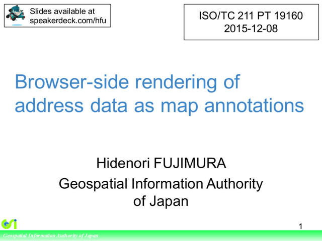 attribute of the annotation feature. – JavaScript program takes care of everything and instructs rendering environments, such as SVG or Canvas. – Better, more elegant way from 19160-5, or left for each implementation? • URLs – http://gsi-cyberjapan.github.io/experimental_anno/ – http://frogcat.github.io/gsi-anno/en/ – http://gsi-cyberjapan.github.io/cmp/joso.html 7