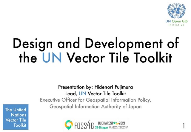 in FOSS4G Asia 2018. 2019-06 Demonstrated to Chief Information Technology Officer of the UN Secretariat. 2019-08 FOSS4G 2019 Bucharest and UN Open GIS Workshop in conjunction 2019-09 FOSS4G 2019 Niigata 2019-10 Hands-on training for the staff from national mapping agencies, as a part of a JICA (Japan International Cooperation Agency) training course. 2019-11 UN-GGIM WG-Disasters session in UN-GGIM-AP plenary * GGIM: Global Geospatial Information Management 2019-11 A presentation in GSI Maps Partner Network 2019-12 Discussion session for the application of the UN Vector Tile Toolkit for Disaster Management 2020-03 UN-GGIM WG-Disasters Task Group B: Scenario-based Exercise - All the schedule is subject to change.