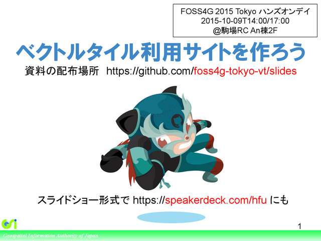 of Japan ベクトルタイル利用サイトを作ろう 資料の配布場所 https://github.com/foss4g-tokyo-vt/slides 1 FOSS4G 2015 Tokyo ハンズオンデイ 2015-10-09T14:00/17:00 @駒場RC An棟2F スライドショー形式で https://speakerdeck.com/hfu にも