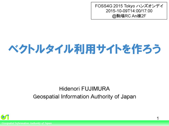of Japan ベクトルタイル利用サイトを作ろう Hidenori FUJIMURA Geospatial Information Authority of Japan 1 FOSS4G 2015 Tokyo ハンズオンデイ 2015-10-09T14:00/17:00 @駒場RC An棟2F