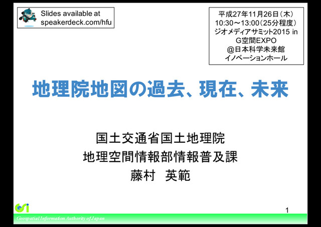 survey act, NSDI act, etc. – 測量法 第27条第2項 • …地図その他一般の利用に供することが必要と認められるものについては、 これらを…不特定多数の者が提供を受けることができる状態に置く措置をとら なければならない。 →データを提供せよ – 地理空間情報活用推進基本法 第3条第6項 • 地理空間情報の活用の推進に関する施策は、地理空間情報を活用した多様 なサービスの提供が実現されることを通じて、国民の利便性の向上に寄与す るものでなければならない。→多様なサービスが実現される社会を作れ – 政府オープンデータ戦略 <実装> (1) 本業としてオープンデータ「地理院タイル」の配信を行え (2) 地理院タイルのショーケースとして「地理院地図」を作れ (3) 多様なサービスが多様な主体により実装される環境を作れ (4) 国民の利便性の向上を目的とせよ 31