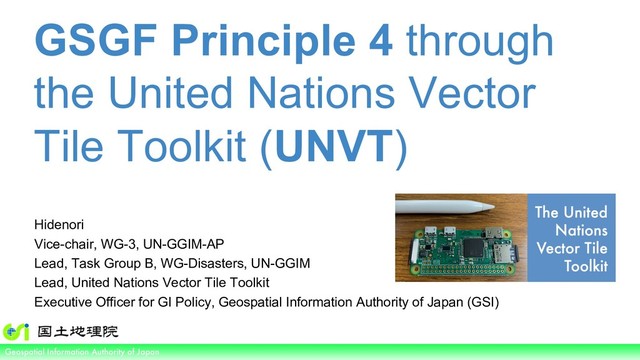 of Japan GSGF Principle 4 through the United Nations Vector Tile Toolkit (UNVT) Hidenori Vice-chair, WG-3, UN-GGIM-AP Lead, Task Group B, WG-Disasters, UN-GGIM Lead, United Nations Vector Tile Toolkit Executive Officer for GI Policy, Geospatial Information Authority of Japan (GSI)