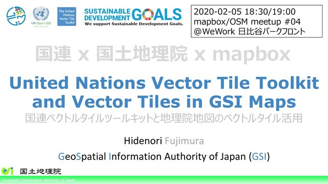 of Japan United Nations Vector Tile Toolkit and Vector Tiles in GSI Maps 国連ベクトルタイルツールキットと地理院地図のベクトルタイル活⽤ Hidenori Fujimura GeoSpatial Information Authority of Japan (GSI) 2020-02-05 18:30/19:00 mapbox/OSM meetup #04 @WeWork ⽇⽐⾕パークフロント 国連 x 国⼟地理院 x mapbox