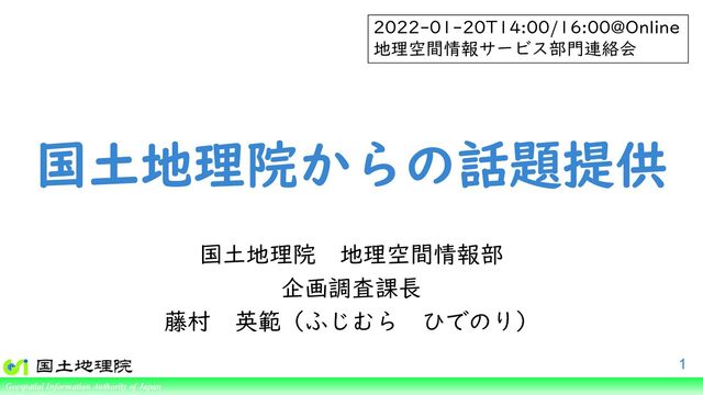 of Japan 国土地理院からの話題提供 国土地理院 地理空間情報部 企画調査課長 藤村 英範(ふじむら ひでのり) 2022-01-20T14:00/16:00@Online 地理空間情報サービス部門連絡会 1
