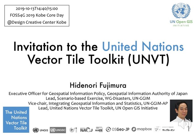 Hidenori Fujimura Executive Officer for Geospatial Information Policy, Geospatial Information Authority of Japan Lead, Scenario-based Exercise, WG-Disasters, UN-GGIM Vice-chair, Integrating Geospatial Information and Statistics, UN-GGIM-AP Lead, United Nations Vector Tile Toolkit, UN Open GIS Initiative 1 2019-10-13T14:40/15:00 FOSS4G 2019 Kobe Core Day @Design Creative Center Kobe