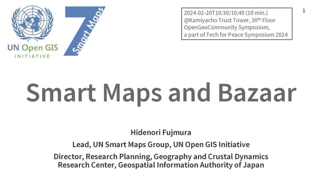 Maps Group, UN Open GIS Initiative Director, Research Planning, Geography and Crustal Dynamics Research Center, Geospatial Information Authority of Japan 2024-02-20T10:30/10:40 (10 min.) @Kamiyacho Trust Tower, 30th Floor OpenGeoCommunity Symposium, a part of Tech for Peace Symposium 2024