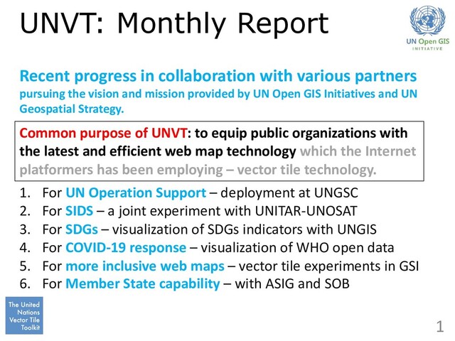 For SIDS – a joint experiment with UNITAR-UNOSAT 3. For SDGs – visualization of SDGs indicators with UNGIS 4. For COVID-19 response – visualization of WHO open data 5. For more inclusive web maps – vector tile experiments in GSI 6. For Member State capability – with ASIG and SOB UNVT: Monthly Report Recent progress in collaboration with various partners pursuing the vision and mission provided by UN Open GIS Initiatives and UN Geospatial Strategy. Common purpose of UNVT: to equip public organizations with the latest and efficient web map technology which the Internet platformers has been employing – vector tile technology. 7