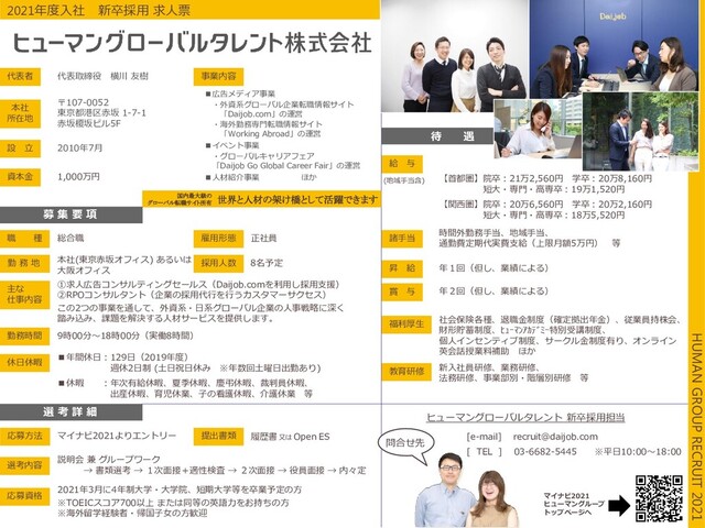 [email protected] [ TEL ] 03-6682-5445 ※平日10:00~18:00 ヒューマングローバルタレント 新卒採用担当 マイナビ2021 ヒューマングループ トップページへ 説明会 兼 グループワーク → 書類選考 → 1次面接+適性検査 → 2次面接 → 役員面接 → 内々定 HUMAN GROUP RECRUIT 2021 代表者 設 立 資本金 本社 所在地 事業内容 勤務時間 勤 務 地 採用人数 雇用形態 昇 給 主な 仕事内容 休日休暇 給 与 職 種 賞 与 諸手当 福利厚生 教育研修 選考内容 応募方法 応募資格 提出書類 募 集 要 項 選 考 詳 細 待 遇 問合せ先 ▪広告メディア事業 ・外資系グローバル企業転職情報サイト 「Daijob.com」の運営 ・海外勤務専門転職情報サイト 「Working Abroad」の運営 ▪イベント事業 ・グローバルキャリアフェア 「Daijob Go Global Career Fair」の運営 ▪人材紹介事業 ほか 履歴書 又は Open ES