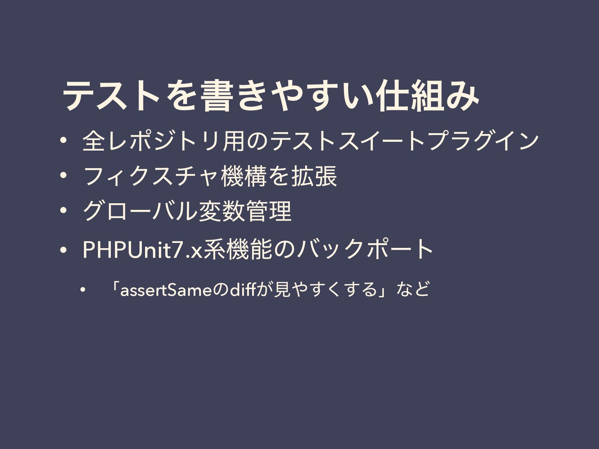 ςετΛॻ͖͍͢Έ • શϨϙδτϦ༻ͷςετεΠʔτϓϥάΠϯ • ϑΟΫενϟػߏΛ֦ு • άϩʔόϧมཧ • PHPUnit7.xܥػೳͷόοΫϙʔτ •