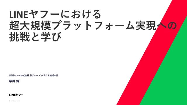 © LY Corporation LINEヤフーにおける 超大規模プラットフォーム実現への 挑戦と学び LINEヤフー株式会社 SIグループ クラウド統括本部 早川