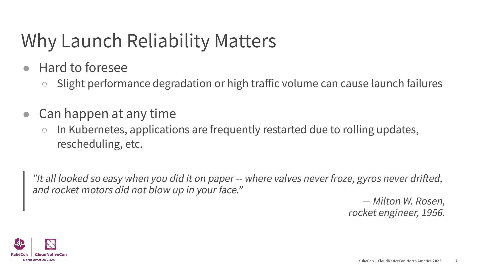 Launch reliability is crucial for applications on Kubernetes that frequently restart. However, applications often struggle to achieve optimal performance immediately after starting, failing to handle the load and experiencing startup failures. This lack of launch reliability can result in service downtime during rollouts and make the horizontal pod autoscaler ineffective. To prevent these issues, it's essential to tune the application and apply various practices within manifests.