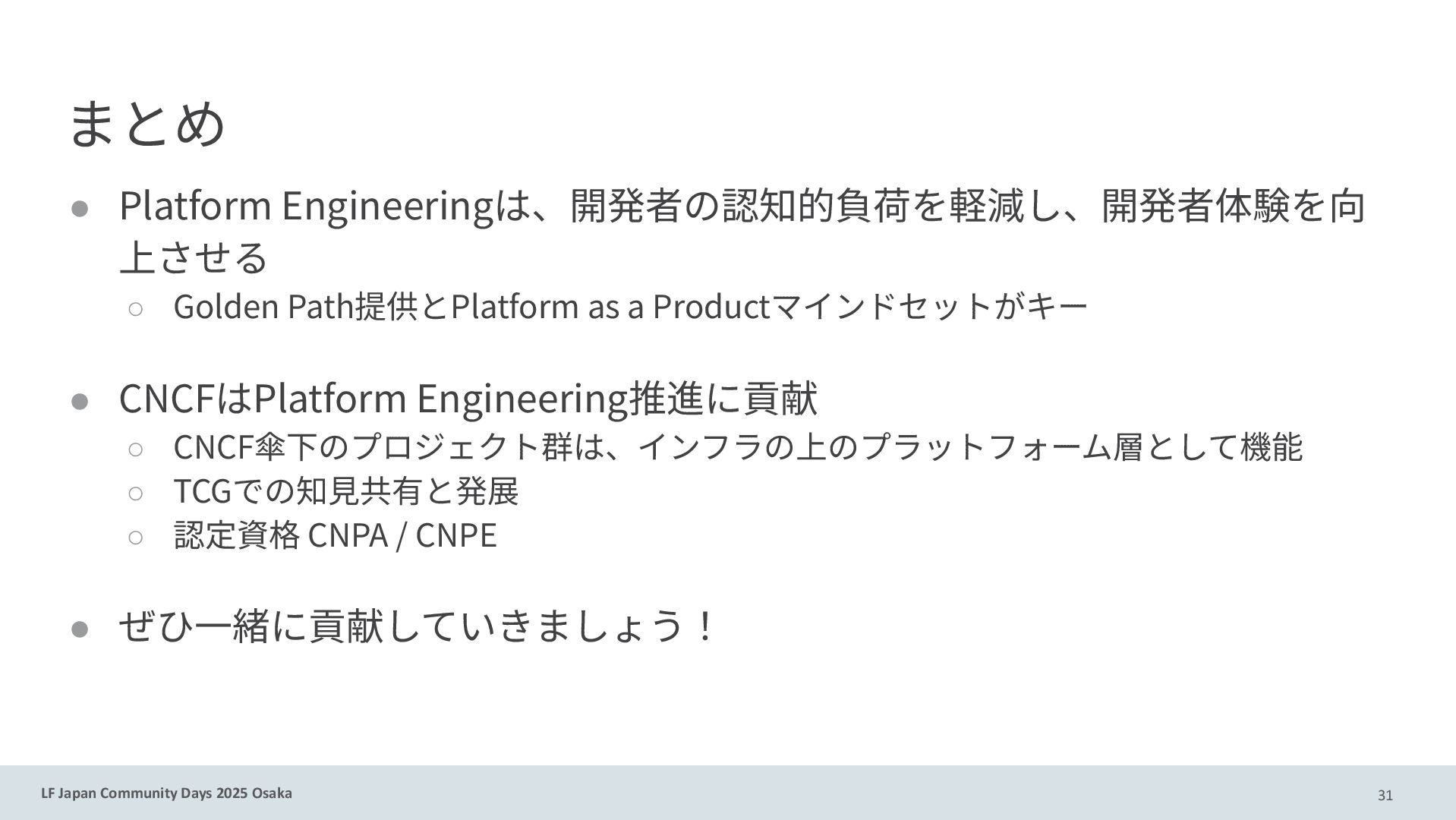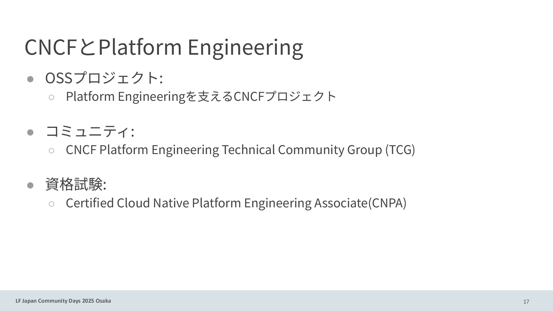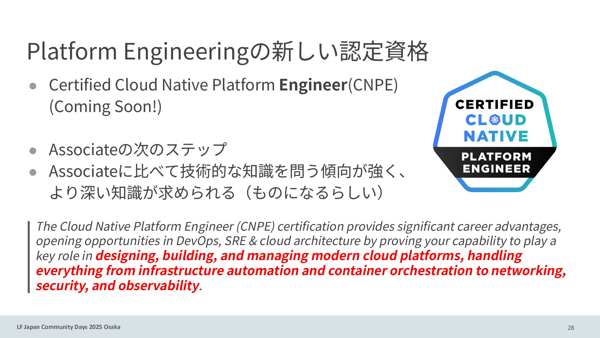 Certified Cloud Native Platform Engineer(CNPE) (Coming Soon!) • Associateの次のステップ • Associateに⽐べて技術的な知識を問う傾向が強く、 より深い知識が求められる(ものになるらしい) The Cloud Native Platform Engineer (CNPE) certification provides significant career advantages, opening opportunities in DevOps, SRE & cloud architecture by proving your capability to play a key role in designing, building, and managing modern cloud platforms, handling everything from infrastructure automation and container orchestration to networking, security, and observability.