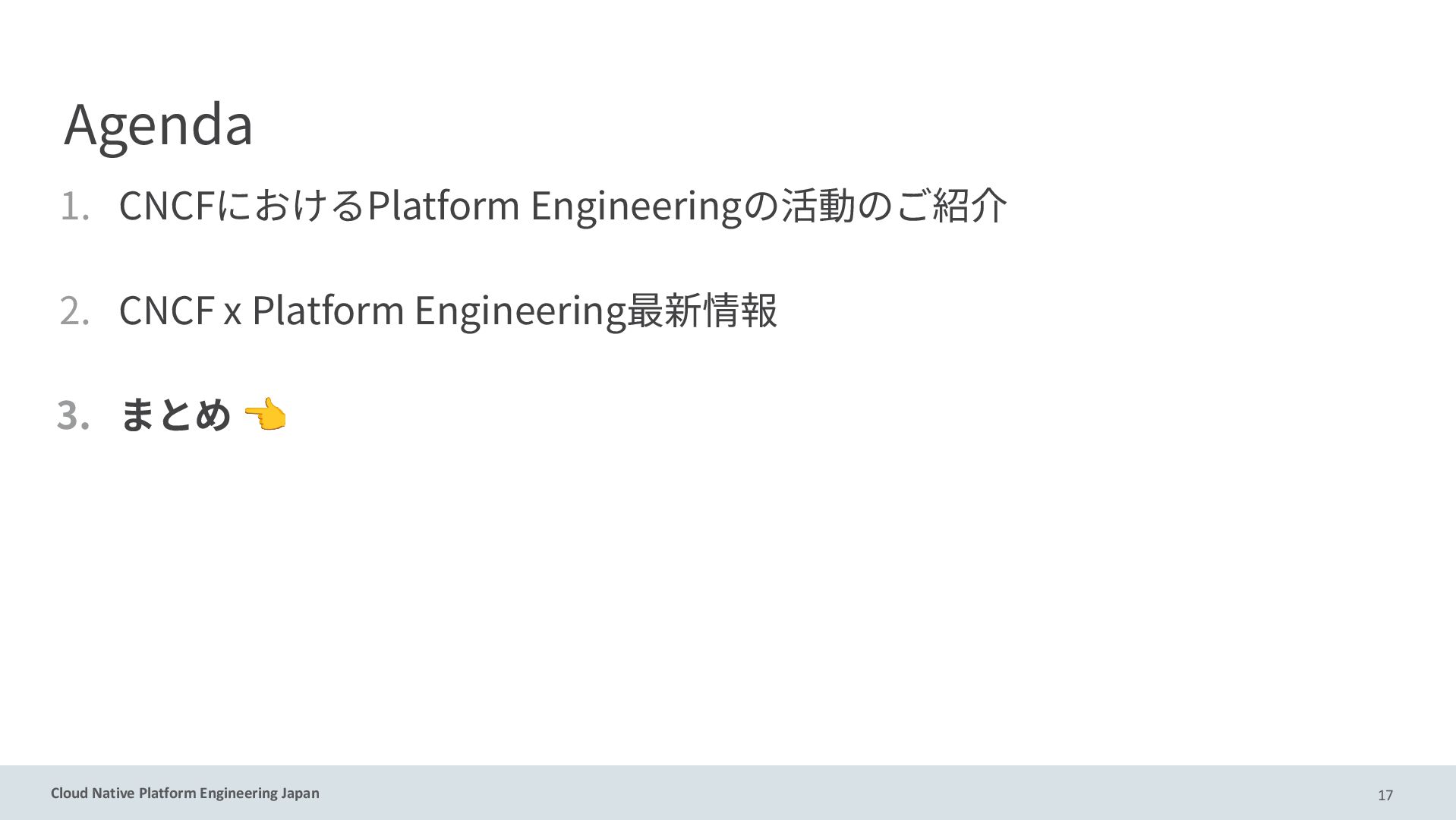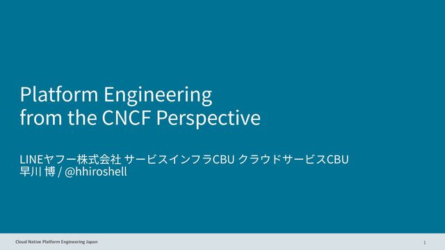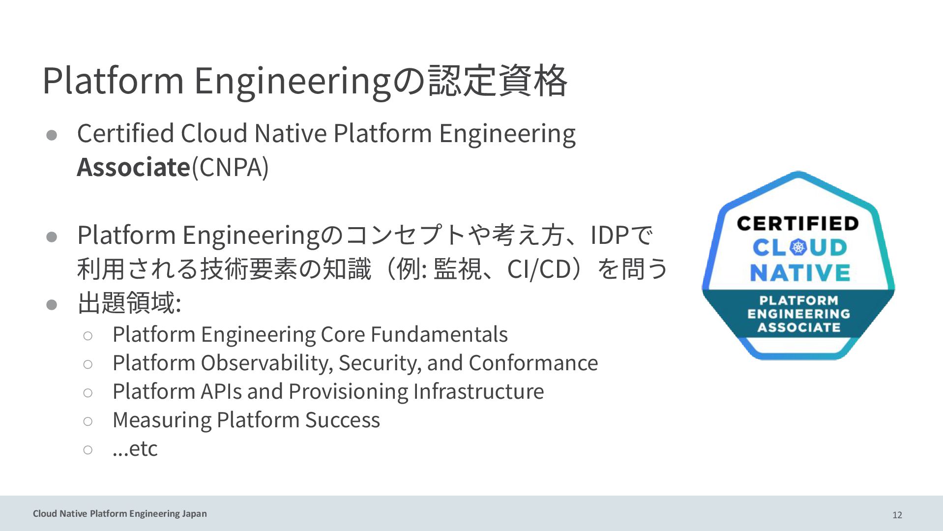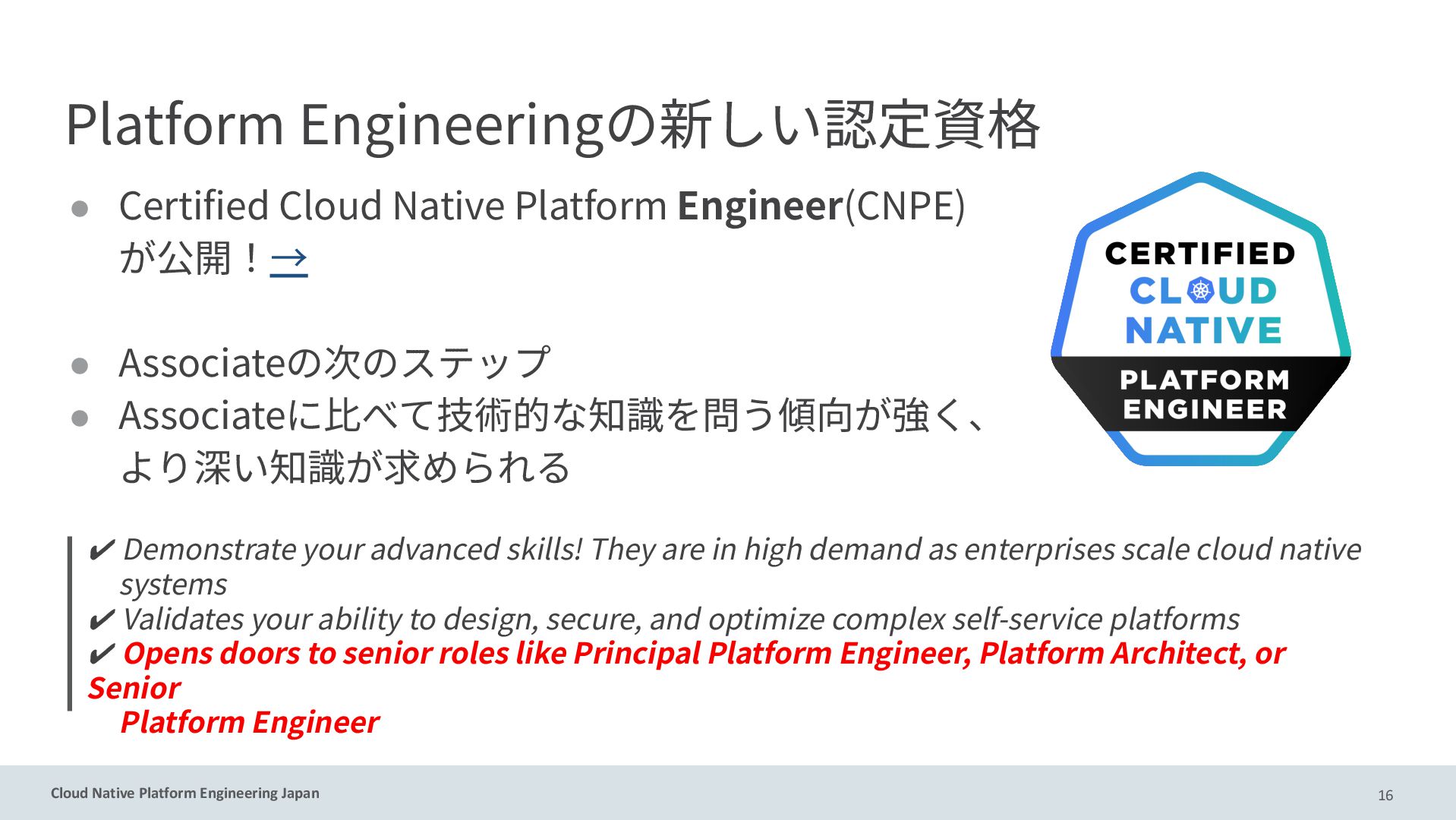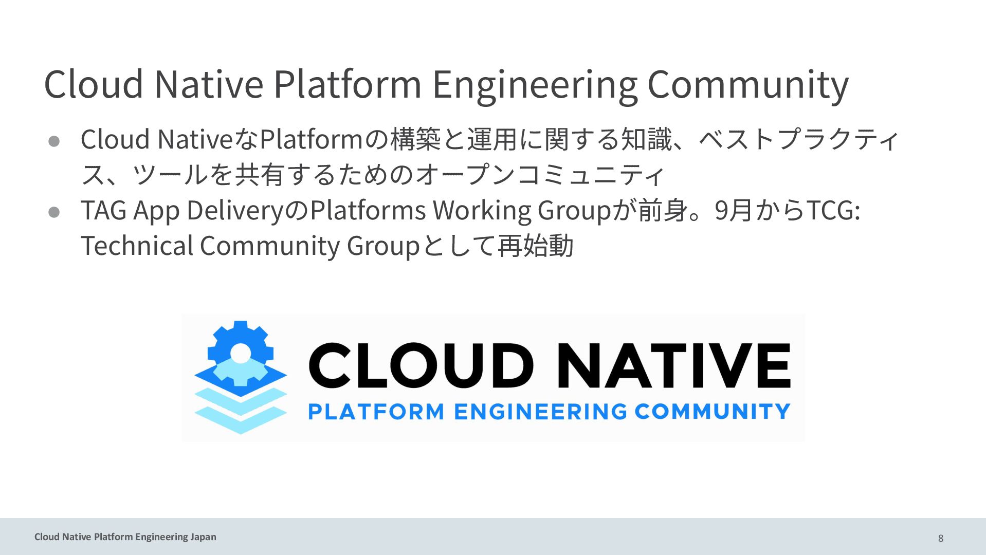 このセッションでは、Cloud Native Computing Foundation(CNCF)の視点からプラットフォームエンジニアリングを考察します。TCG(Technical Community Group)、プラットフォームエンジニアリング成熟度モデル、CNPA/CNPEプログラムなど、CNCFのプロジェクトやコミュニティの取り組み、認定制度が、プラットフォーム実践の未来をどのように形作っているかを紹介します。