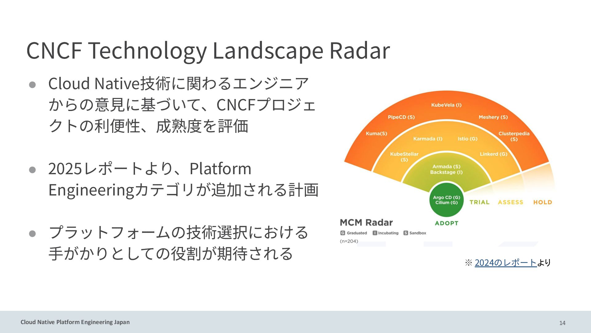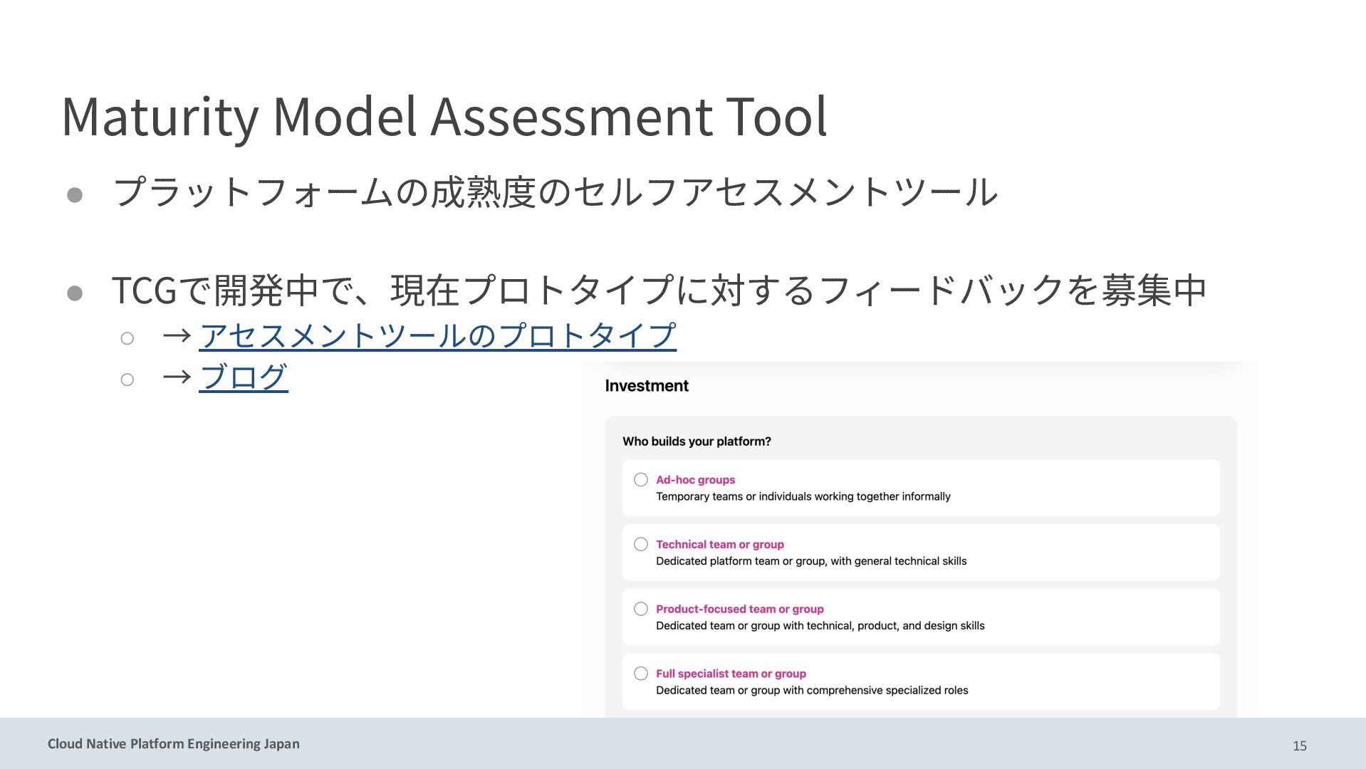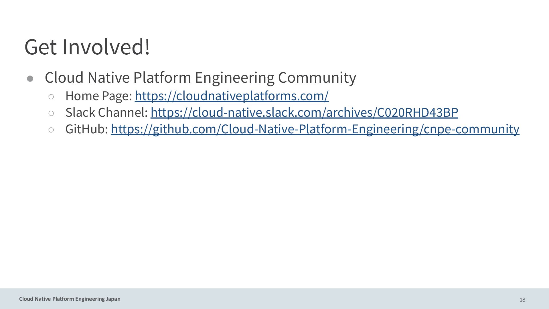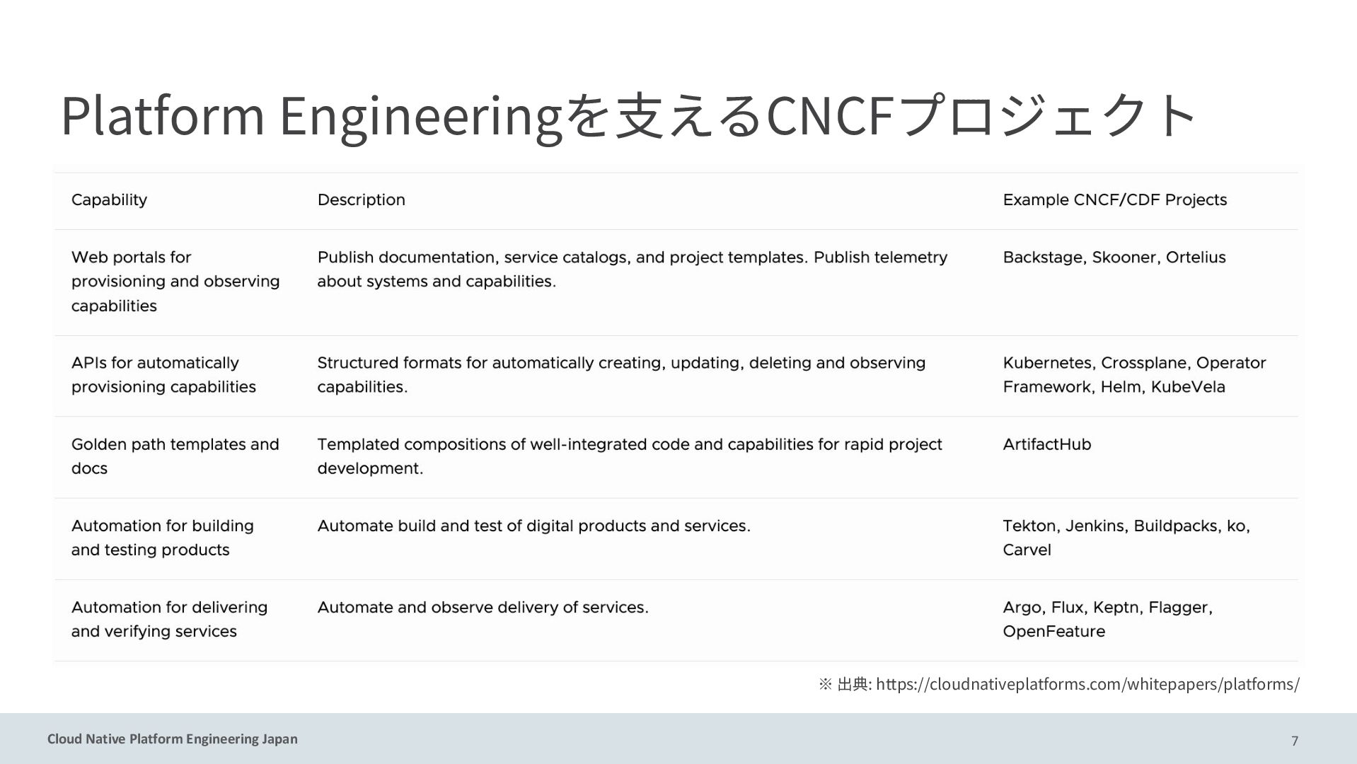 このセッションでは、Cloud Native Computing Foundation(CNCF)の視点からプラットフォームエンジニアリングを考察します。TCG(Technical Community Group)、プラットフォームエンジニアリング成熟度モデル、CNPA/CNPEプログラムなど、CNCFのプロジェクトやコミュニティの取り組み、認定制度が、プラットフォーム実践の未来をどのように形作っているかを紹介します。