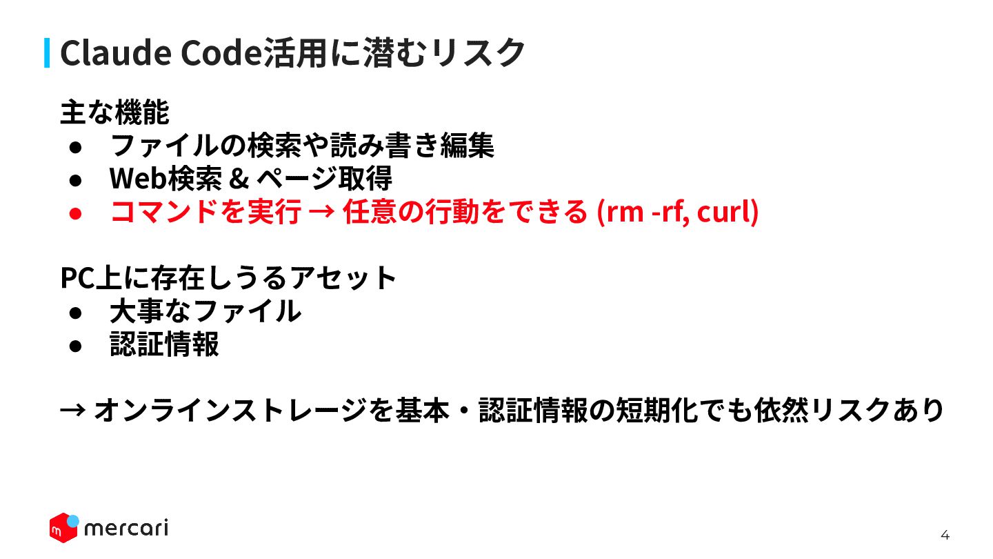 • コマンドを実⾏ → 任意の⾏動をできる (rm -rf, curl) PC上に存在しうるアセット • ⼤事なファイル • 認証情報 → オンラインストレージを基本‧認証情報の短期化でも依然リスクあり