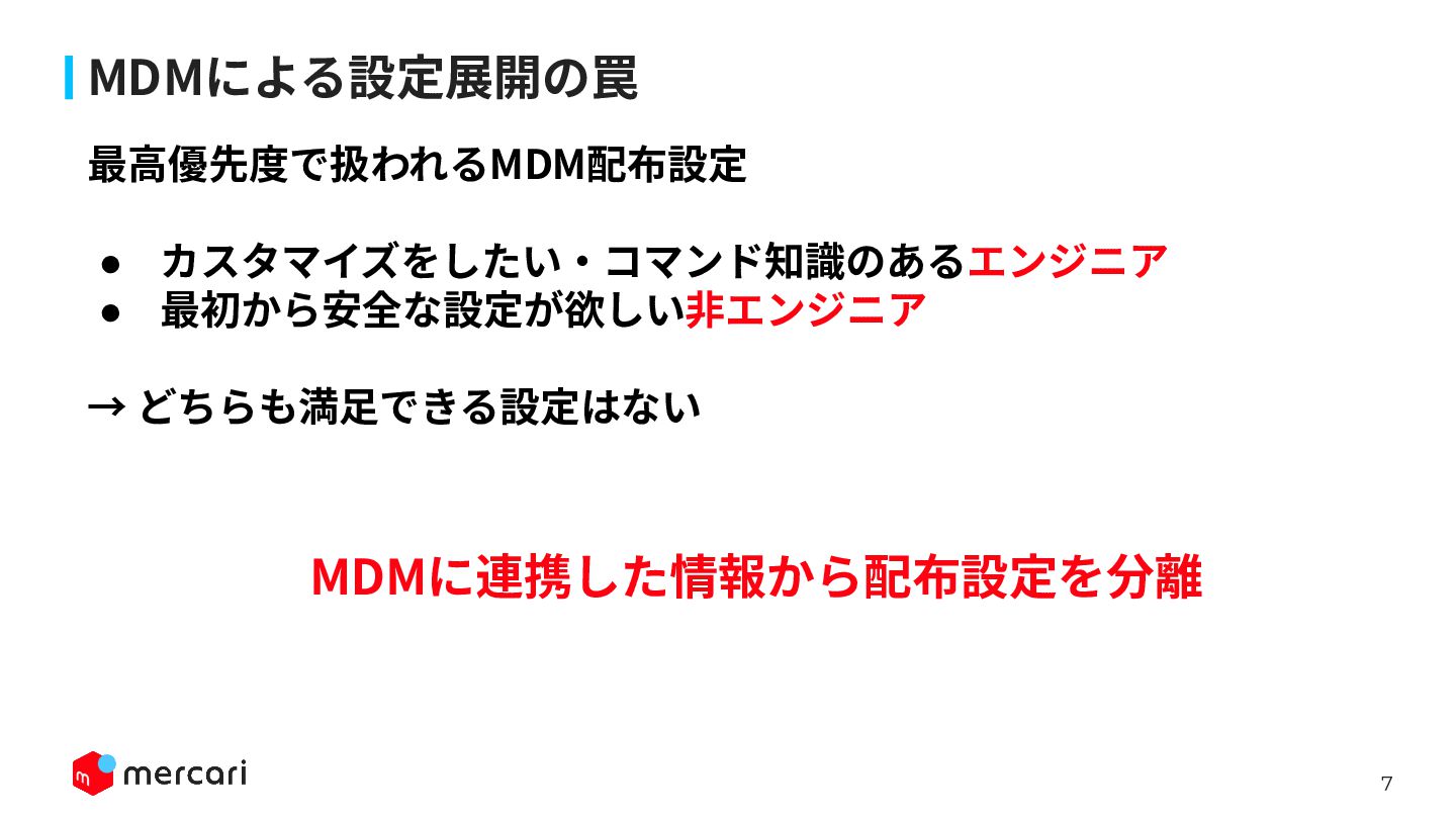 7 MDMによる設定展開の罠 最⾼優先度で扱われるMDM配布設定 • カスタマイズをしたい‧コマンド知識のあるエンジニア • 最初から安全な設定が欲しい⾮エンジニア → どちらも満⾜できる設定はない MDMに連携した情報から配布設定を分離